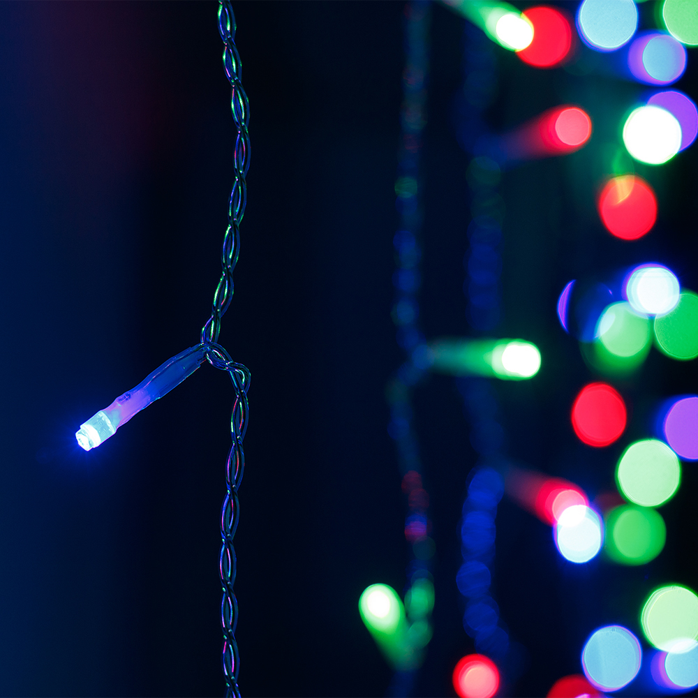 Светодиодный Занавес Home. Размер 2000×2500 мм (длина 1500 мм, высота 1500 мм). 12 ниспадающих нитей длиной 2500 мм. 300 светодиодов размером 5 мм. Цвет свечения RGBY, (цвет светодиодов чередуется), постоянное свечение и 8 динамических эффектов с резким световым рисунком (прозрачная вогнутая линза). Провод прозрачный, ПВХ. Питание 230 В, Мощность 18 Вт, защита IP20, применение в помещении. Аксессуар для подключения и выбора режима свечения в комплекте.