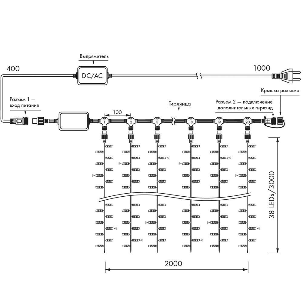 Светодиодный Занавес Pro. Размер 2000×3000 мм (длина 2000 мм, высота 3000 мм). 20 ниспадающих нитей длиной 3000 мм. 760 светодиодов размером 7 мм. Основной цвет свечения ТЕПЛЫЙ БЕЛЫЙ (3000 К), эффект мерцания редких точек ТЕПЛЫЙ БЕЛЫЙ (3000К) с резким световым рисунком (прозрачная вогнутая линза), соотношение светодиодов: 634 теплых постоянного свечения / 126 теплых с мерцанием. Эффект частого мерцания. Провод белый, каучук. Питание 230 В, Мощность 70 Вт, защита IP65, применение в помещении и на улице под навесом. Аксессуар для подключения и выбора режима свечения в комплекте.