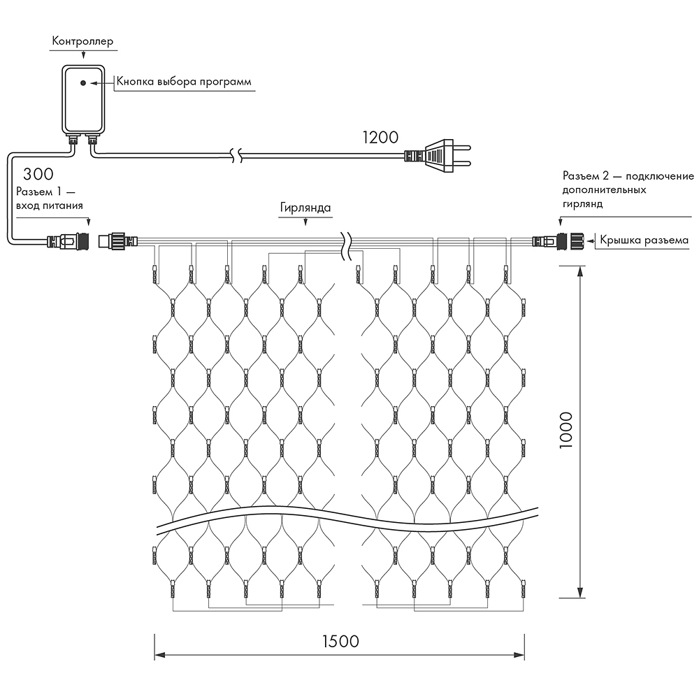 Светодиодная сеть Home. 1500×1000 (длина 1500 мм, высота 1000 мм). Цвет свечения RGBY (светодиоды чередуются). 96 светодиодов размером 5 мм со статическим и 8 динамическими эффектами свечения с резким световым рисунком (прозрачная вогнутая линза). Провод прозрачный, ПВХ. Питание 230 В, Мощность 9 Вт, защита IP20, применение в помещении. Аксессуары для подключения и выбора режима свечения в комплекте.