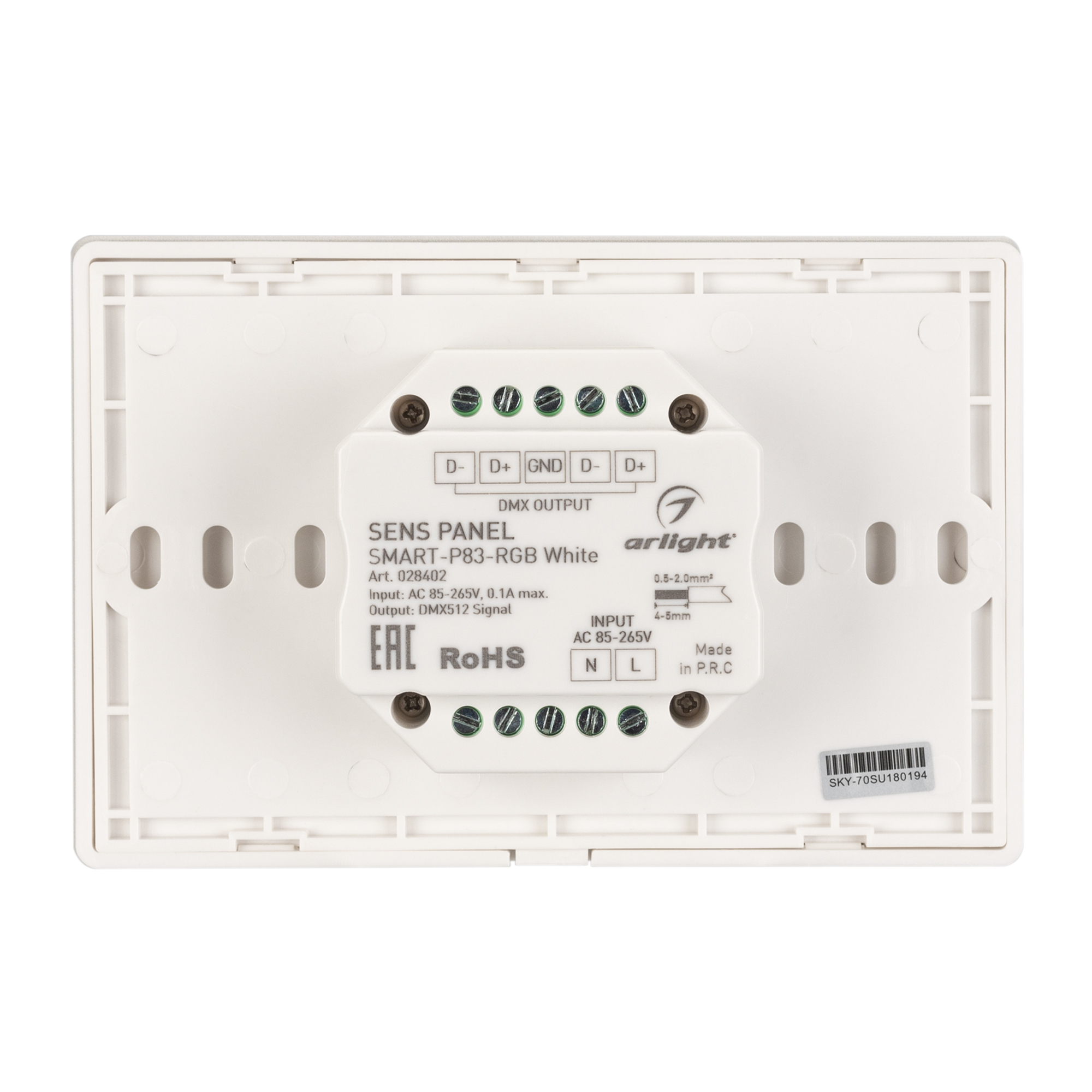 Встраиваемая сенсорная панель в “итальянском” стиле, изготовленная из высококачественного стекла, защищенного от появления царапин. Изделие позволяет осуществлять основные функции управления светом: включение/выключение, регулировка яркости, управление цветом (RGB), сохранение предустановок для 4 световых зон. Панель совместима с диммерами и контроллерами SMART по радиоканалу 2.4G (количество привязываемых диммеров и контроллеров не ограничено) и может управлять DMX-диммерами по проводной шине DMX512. Выходной сигнал DMX соответствует стандартному протоколу DMX512 и совместим с оборудованием DMX любого производителя. Панель белого цвета, питание от сети 230В. Габариты устройства 120х80х37 мм, встраивается в стандартную монтажную коробку.