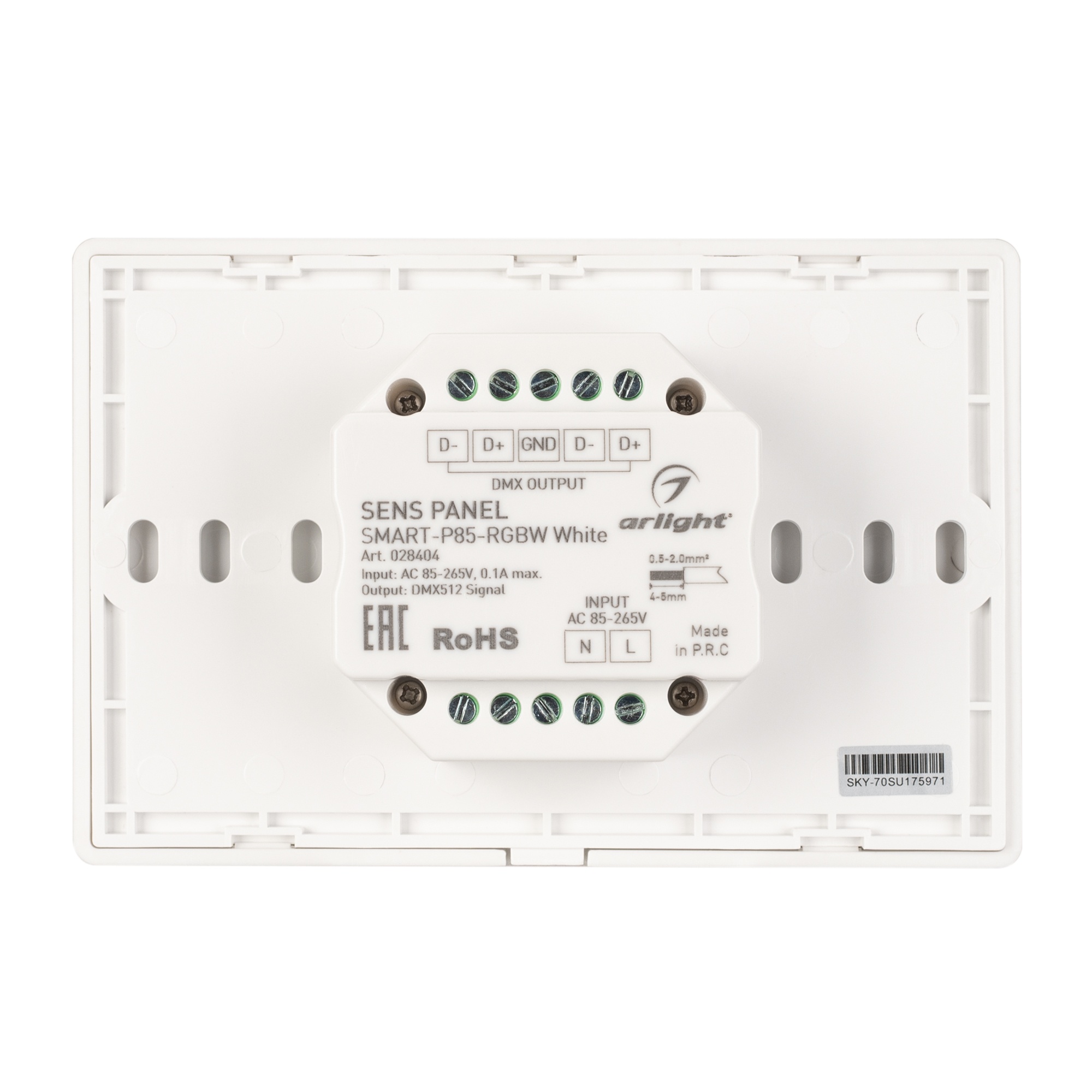 Встраиваемая сенсорная панель в “итальянском” стиле, изготовленная из высококачественного стекла, защищенного от появления царапин. Изделие позволяет осуществлять основные функции управления светом: включение/выключение, регулировка яркости, управление цветом (RGBW), сохранение предустановок для 4 световых зон. Панель совместима с диммерами и контроллерами SMART по радиоканалу 2.4G (количество привязываемых диммеров и контроллеров не ограничено) и может управлять DMX-диммерами по проводной шине DMX512. Выходной сигнал DMX соответствует стандартному протоколу DMX512 и совместим с оборудованием DMX любого производителя. Панель белого цвета, питание от сети 230В. Габариты устройства 120х80х37 мм, встраивается в стандартную монтажную коробку.