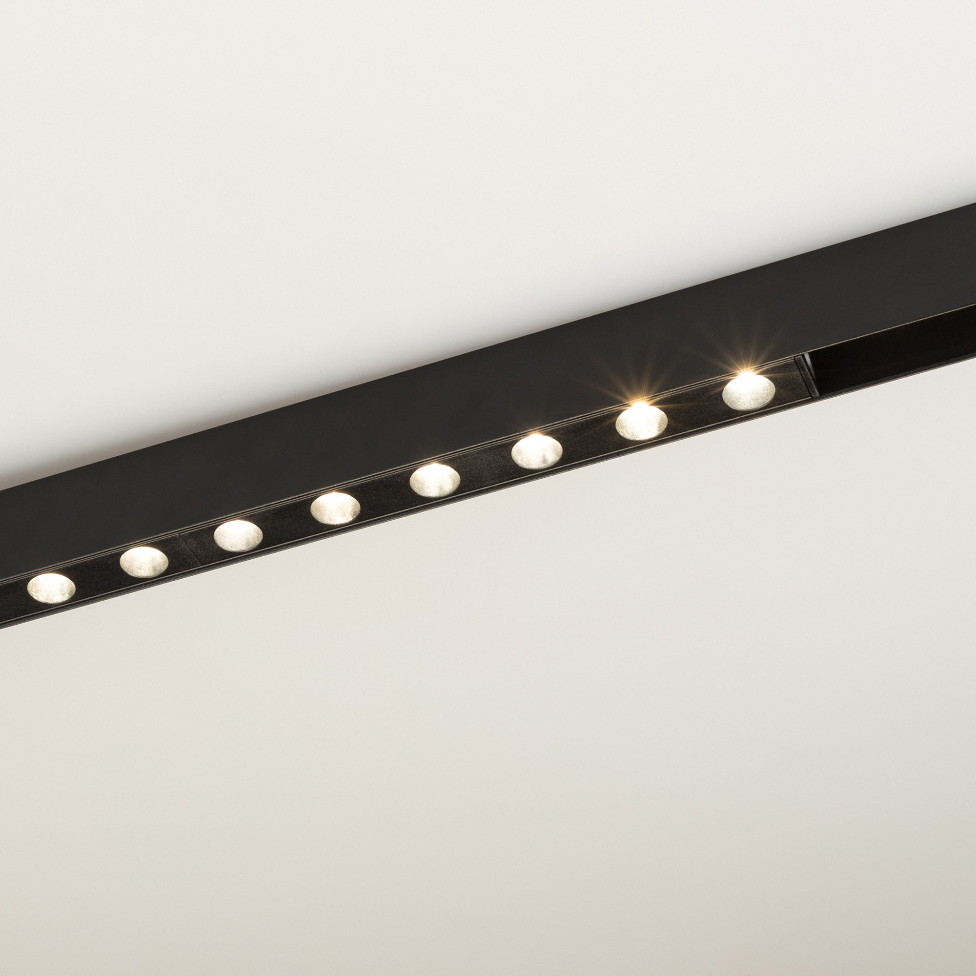 Линейный светодиодный светильник MAG-DOTS-25-L600-18W Day4000 (BK, 30 deg, 24V, DALI) мощностью 18 Вт для магнитных треков MAG-25 с управлением DALI. Светодиоды снабжены линзами, расположены в индивидуальных ячейках и обеспечивают узкий угол и дневной белый цвет свечения (4000 К), световой поток 1050 лм и высокий индекс цветопередачи CRI>90 гарантируют качественное освещение с точной передачей цветовых оттенков. Есть возможность управлять яркостью по протоколу DALI. У светильника безопасное напряжение 24 В и быстрая установка в шинопровод с помощью магнитов. Драйвер для подключения поставляется отдельно.