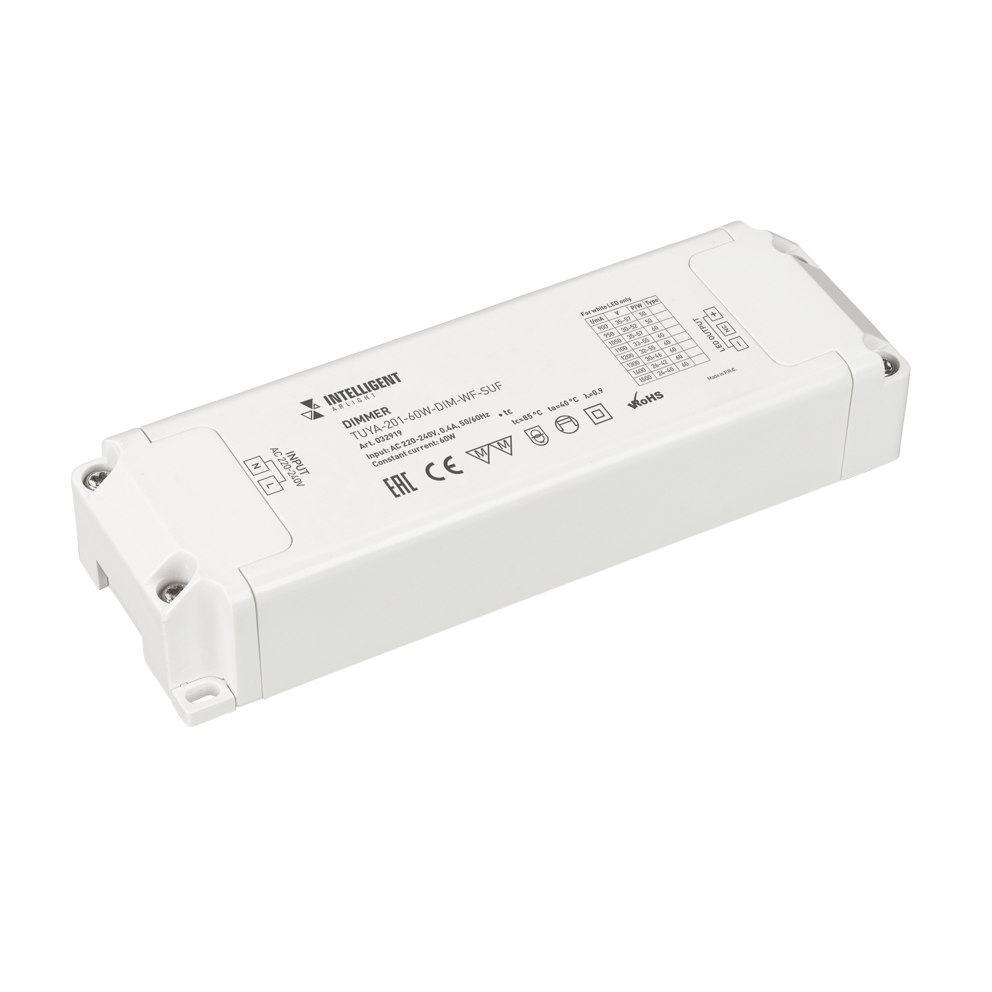 Диммер одноканальный, для светодиодных светильников. Выбор значения выходного тока осуществляется подстроечным резистором на плате. Вход 220-240V AC, PF>0.95 выход 900trash500mA@24-50V DC (в зависимости от вых. тока), мощность 60W. Низкий пусковой ток <5А@100mks. Защита от КЗ на выходе, перегрузки, перегрева. Управление через WI-FI 2.4ГГц.Управляется панелями серии TY-228-х-RF, совместим с платформой TUYA, и АЛИСА от ЯНДЕКС. Управление со смартфона через приложение INTELLIGENT ARLIGHT