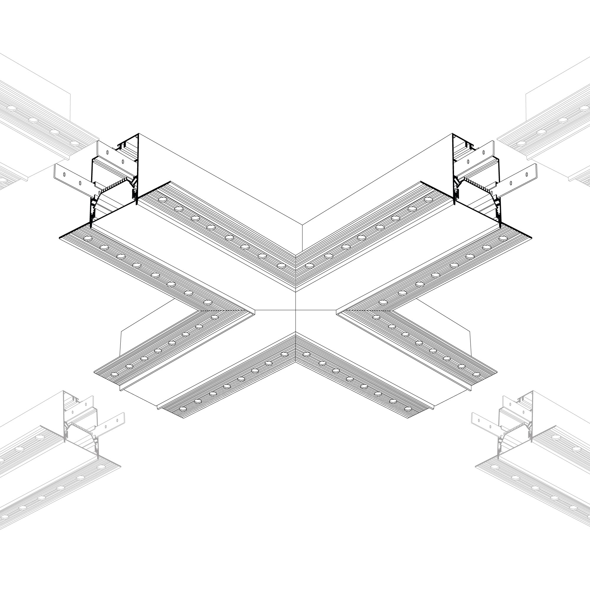 Крестовой угол в сборе для соединения четырех профилей SL-LINIA55-FANTOM под прямыми углами 90° в одной плоскости в комплекте с матовым экраном, соединителями и винтами. Экран образует Х-образную фигуру на плоскости. Применятся при изготовлении светильников сложной геометрии. Длина крестовины 400 мм. Цена за комплект.