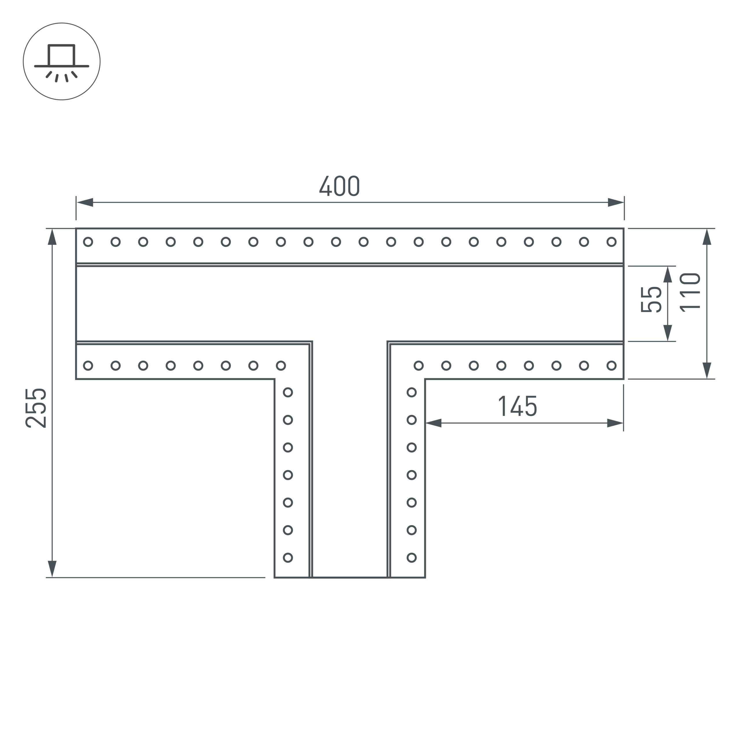 Т-образный угол в сборе со скрытым фланцем под строительную отделку для соединения трех профилей SL-LINIA55-FANTOM под прямыми углами 90° в одной плоскости в комплекте с матовым экраном и соединителями. Экран образует Т-образную фигуру на плоскости. Применятся при изготовлении светильников сложной геометрии.