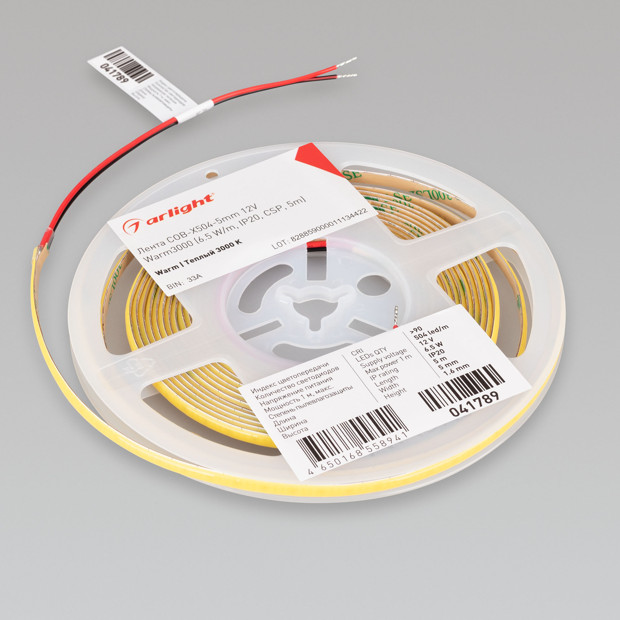 Узкая светодиодная лента сплошного свечения COB серии X504 шириной 5 мм, мощностью 6.5 Вт/м. Напряжение питания 12 В. Светодиоды CSP, 504 шт/м, теплого цвета свечения (3000K). Высокий индекс цветопередачи CRI>90 обеспечивает точное восприятие цветовых оттенков при освещении любых жилых, офисных или производственных помещений. Минимальный отрезок 7.94 мм. Эффект сплошной линии света создается без применения рассеивающих экранов. Узкая плата позволяет установить ленту в тонкий паз, применяется для подсветки витрин, рекламных конструкций, мебели, полок. Рекомендуется установка на профиль.