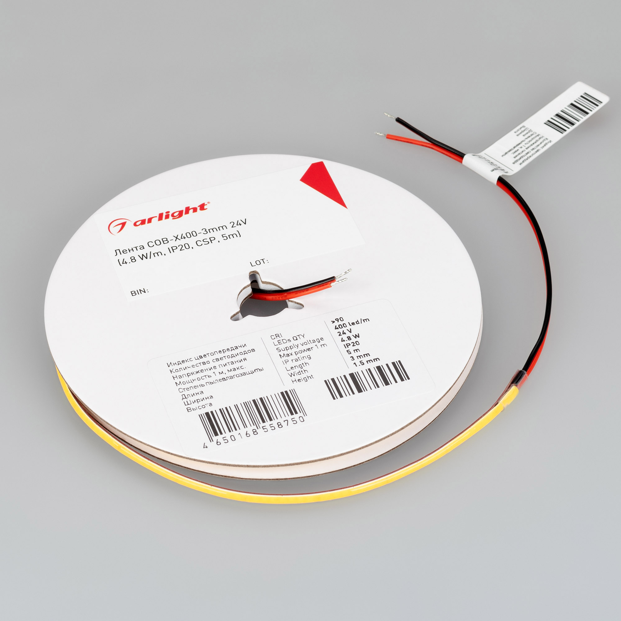 Узкая светодиодная лента сплошного свечения COB серии X400 шириной 3 мм, мощностью 4.8 Вт/м. Цвет свечения дневной (4000K). Напряжение питания 24 В. Светодиоды CSP, 400 шт/м. Высокий индекс цветопередачи CRI>90 обеспечивает точное восприятие цветовых оттенков при освещении любых жилых, офисных или производственных помещений. Минимальный отрезок 20 мм. Эффект сплошной линии света создается без применения рассеивающих экранов. Узкая плата позволяет установить ленту в тонкий паз, применяется для подсветки витрин, рекламных конструкций, мебели, полок.