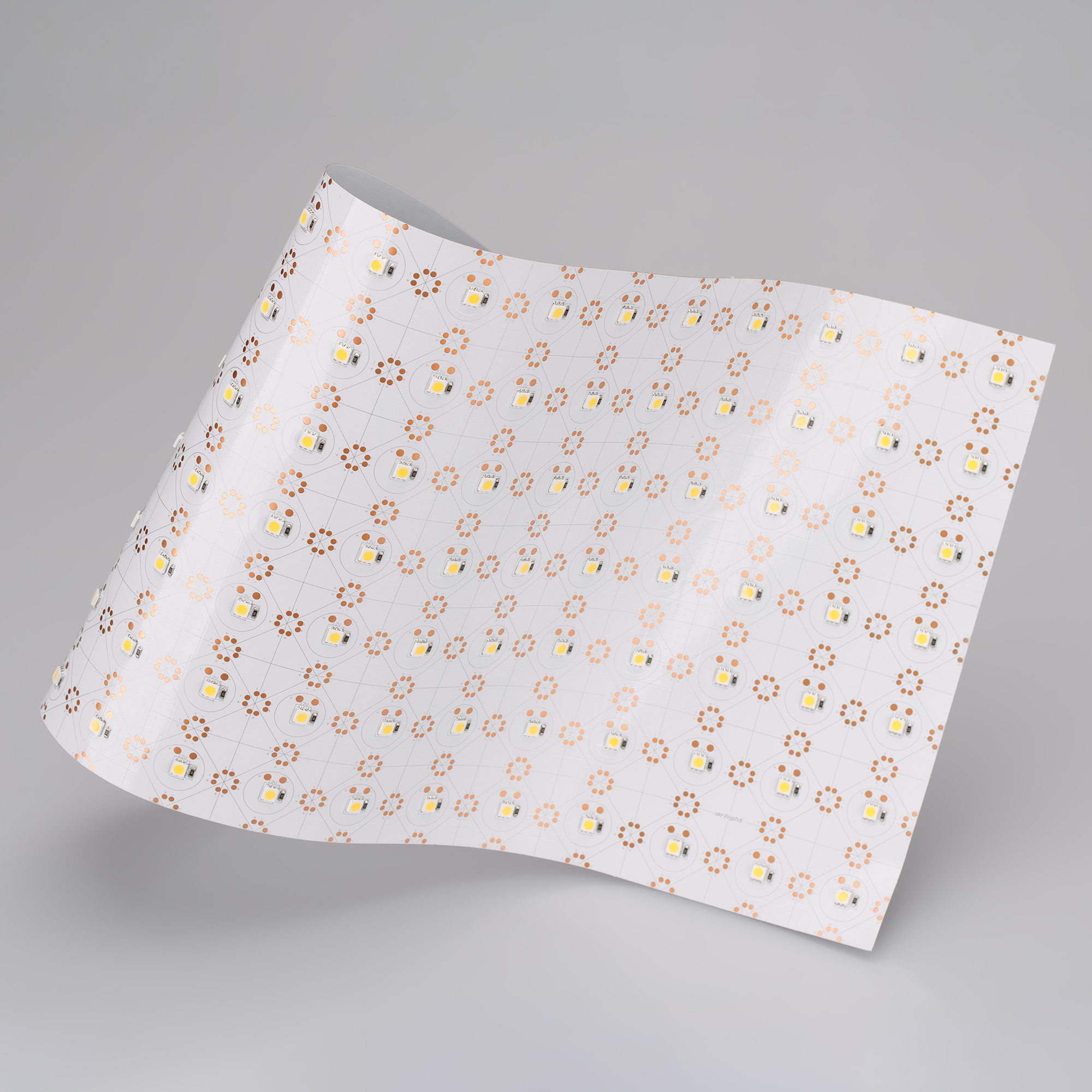 Светодиодный лист для равномерной подсветки большой площади. Светодиоды SMD 5060 (105 шт/м) зеленого цвета свечения. Мощность всего листа 22 Вт, одного сегмента — 0.2 Вт. Напряжение питания 12 В. Можно вырезать фигуры и буквы произвольной формы по линиям на плате. Подача питания в любой точке ‘+’ и ‘−’. Минимальный сегмент 34×34 мм. Дополнительный теплоотвод не обязателен.