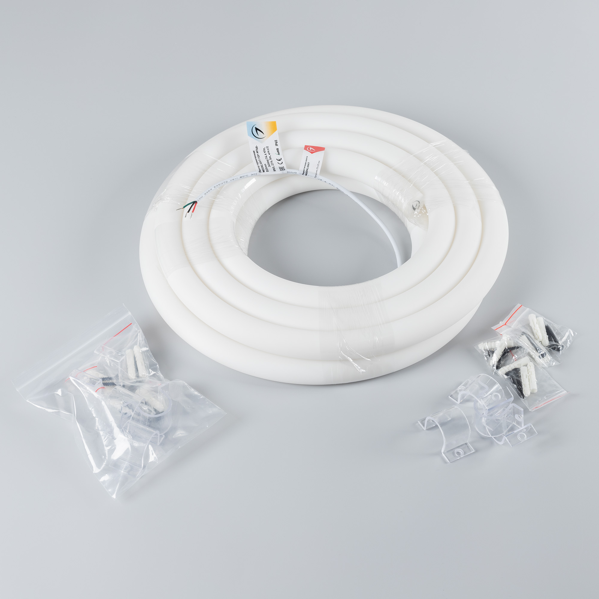 Гибкая герметичная лента MOONLIGHT имеет круглое сечение 25×25 мм и оснащена 768 светодиодами SMD2216 на метр. Возможность изменять цветовую температуру (2300К-4000К) позволяет подобрать нужный оттенок для вашего освещения, а высокий индекс цветопередачи (CRI>90) позволяет создать отличную различимость цветовых оттенков. Угол излучения ленты составляет 360°, что позволит создавать с ее помощью уникальные элементы декора. Лента потребляет 14,4 Вт/м и работает от 24 V. Класс пылевлагозащиты IP65 позволяет использовать ленту в т.ч. во влажных помещениях, и имеет минимальный радиус изгиба 120 мм. Резка ленты не предусмтрена. Габариты ленты составляют 5000×25×25 мм. Кабель питания длиной 500 мм выводится с одной стороны вдоль линии сечения ленты. Катушка содержит 5 м ленты. Цена указана за 1 м ленты. Гарантия на ленту составляет 3 года. Список совместимых аксессуаров, с помощью которых можно создавать уникальные декоративные композиции, находится в разделе “Совместимые”.