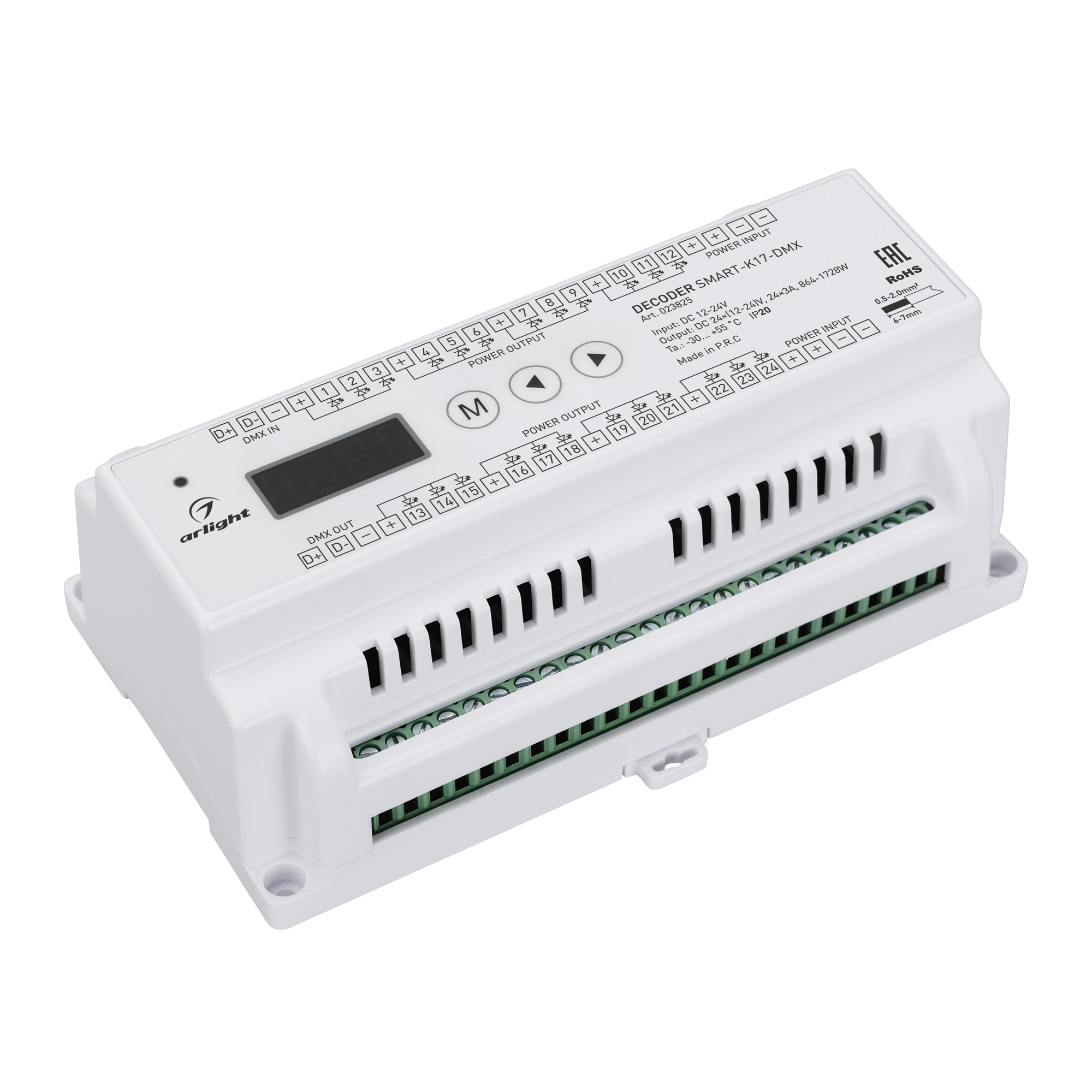 Декодер (преобразователь) цифрового сигнала DMX512 в ШИМ для управления светодиодными лентами. Декодер может регулировать яркость мультицветных лент, осуществлять включение и выключение света, управлять цветом. Декодер совместим с панелями управления с выходом DMX512 и контроллерами DMX512. Также, управление декодером осуществляется кнопками на корпусе, а информация о режиме отображается на цифровом дисплее. Питание декодера имеет диапазон напряжений от 12В до 36В, максимальный ток 5А на 1 канал, максимальная мощность 864-1720Вт (в зависимости от напряжения питания), 24 канала управления. Габариты декодера составляют 160x88x60мм, корпус белого цвета, установка на DIN-рейку.