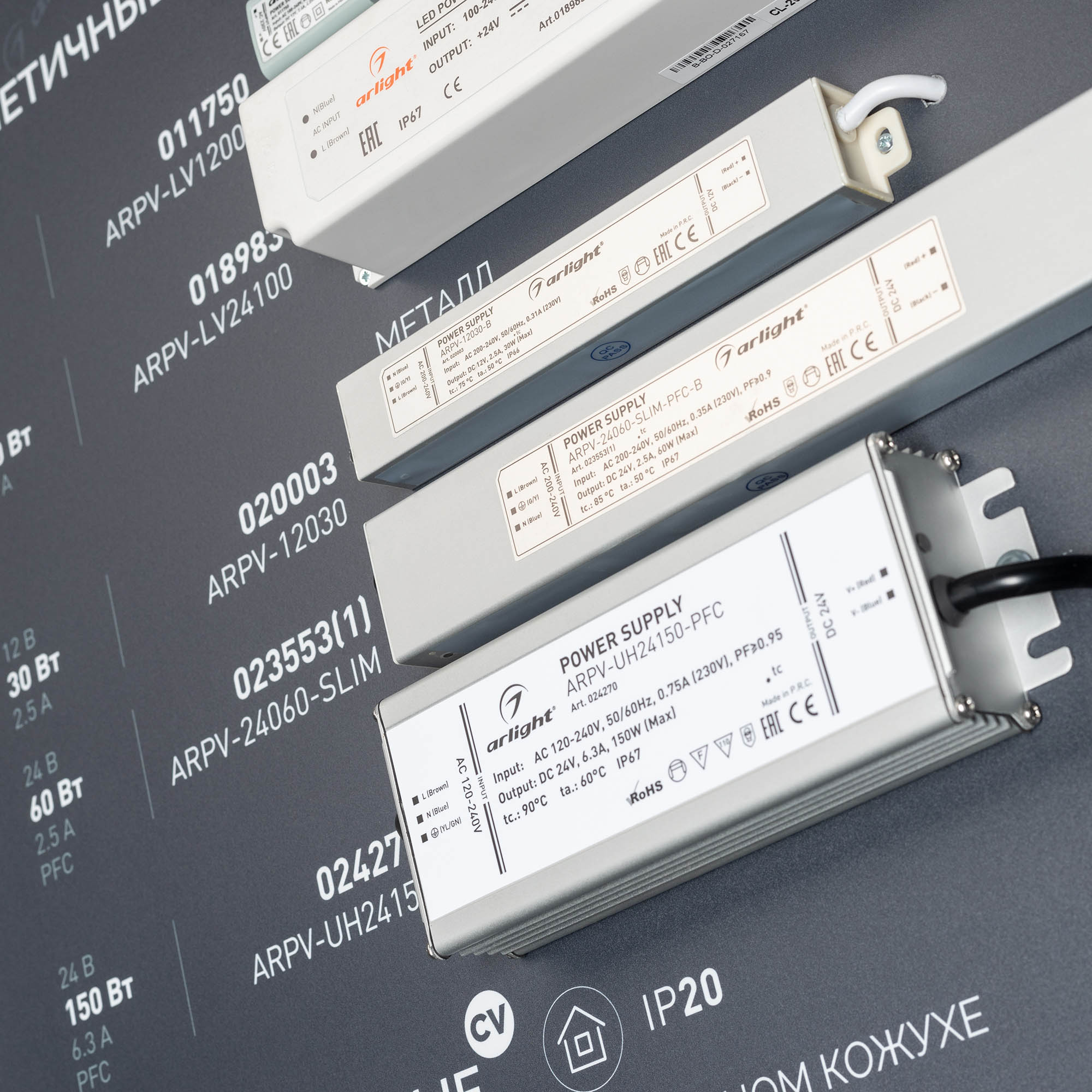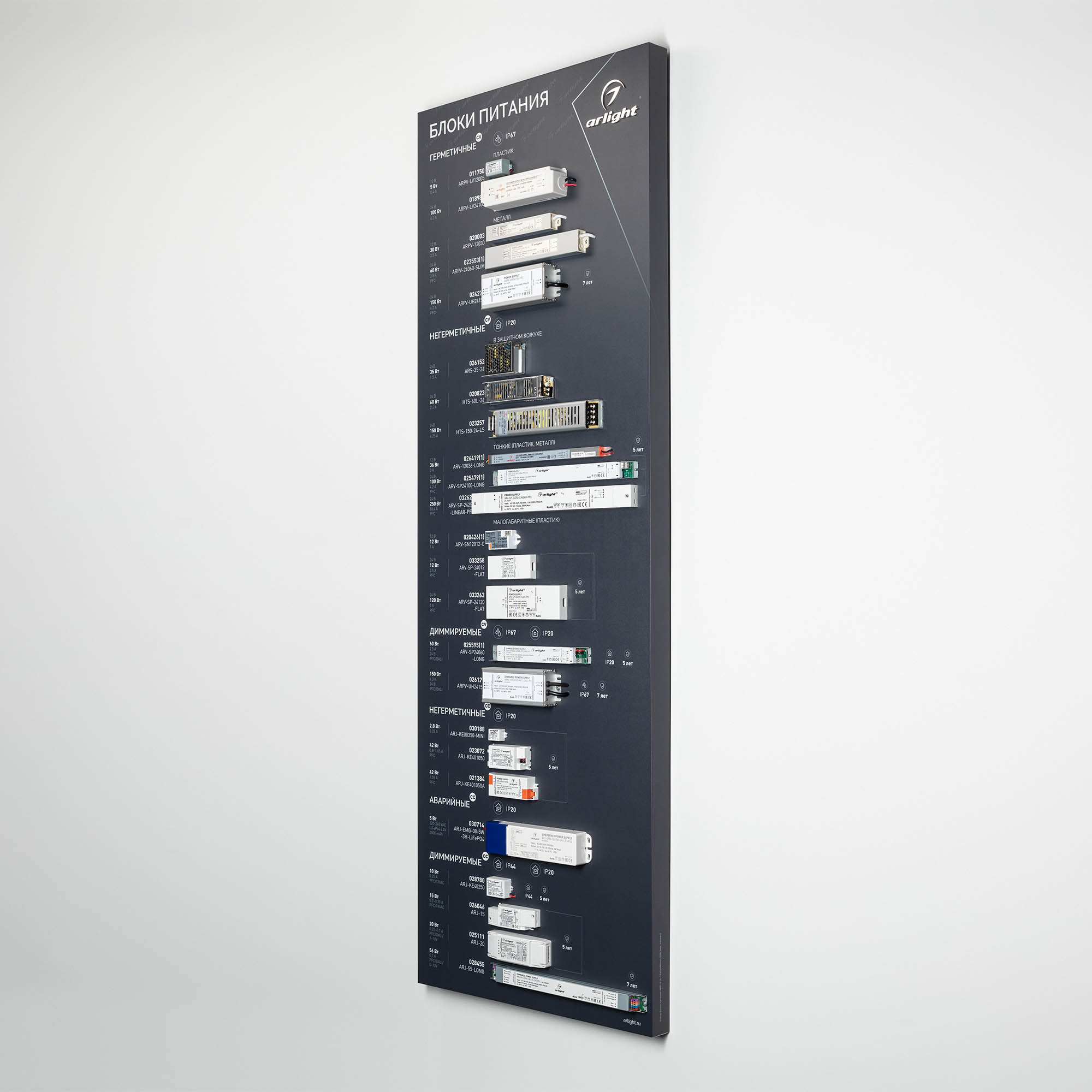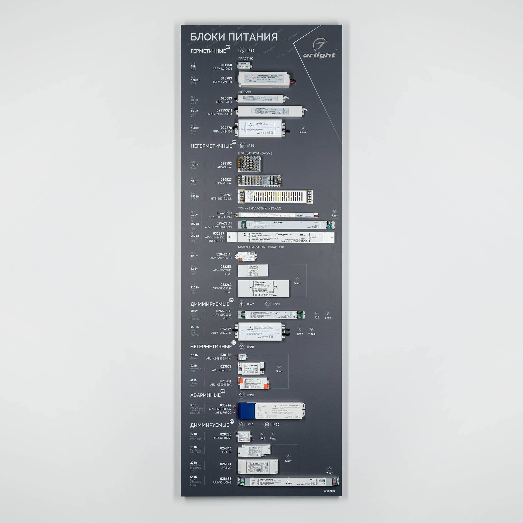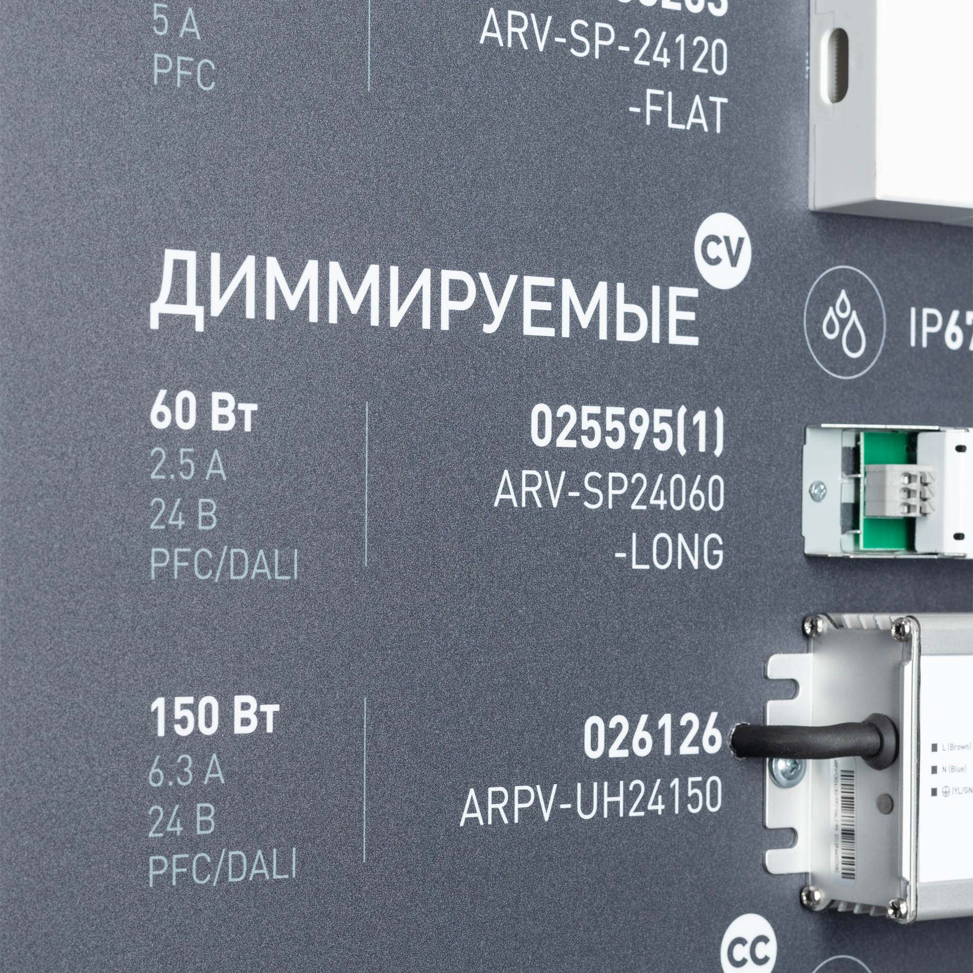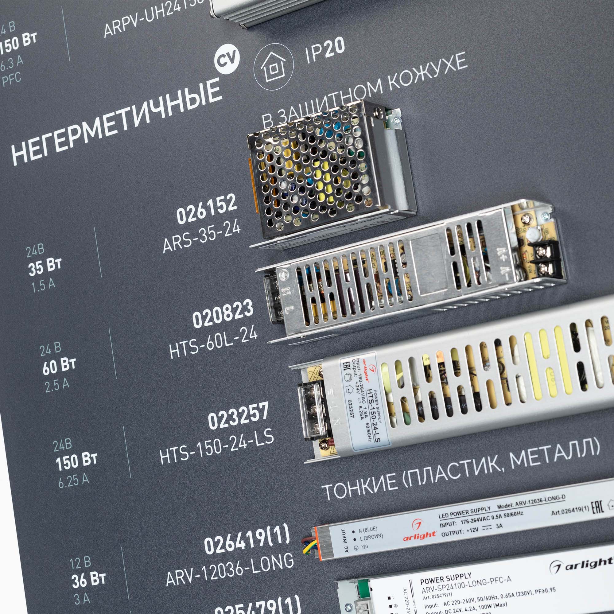 Обзорный стенд по ассортименту блоков питания. Представлены модели CV и CC, герметичные и негерметичные, диммируемые, аварийные блоки питания. Стенд без электроподключения.