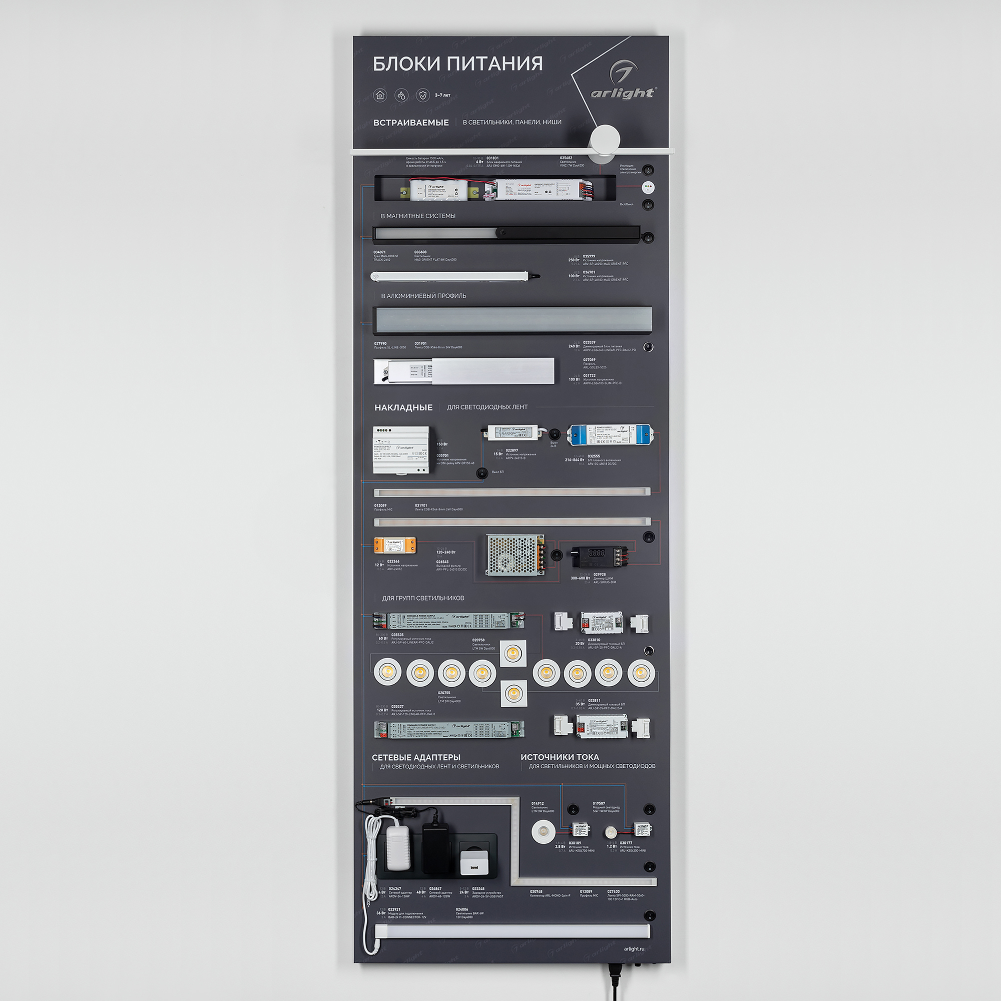 На стенде представлен широкий ассортимент блоков питания Arlight для различных источников освещения: светодиодные ленты, светильники, мощные светодиоды и т. п. Показаны варианты встройки блоков питания в ниши и в профиль. Реализован механизм плавного включения светодиодной ленты.