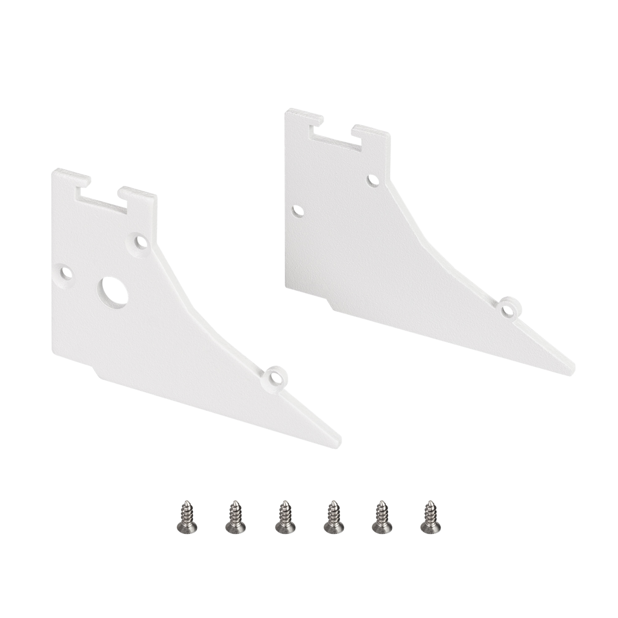 Белые металлические заглушки (левая с отверстием – 1 шт., правая без отверстия – 1 шт.) для профиля FANTOM-W45-BEVEL. Придают законченный вид светильнику, а также защищают светодиодную ленту от внешних факторов (грязи, пыли и прочего). Отверстие в заглушке позволяет вывести кабель питания светодиодной ленты.