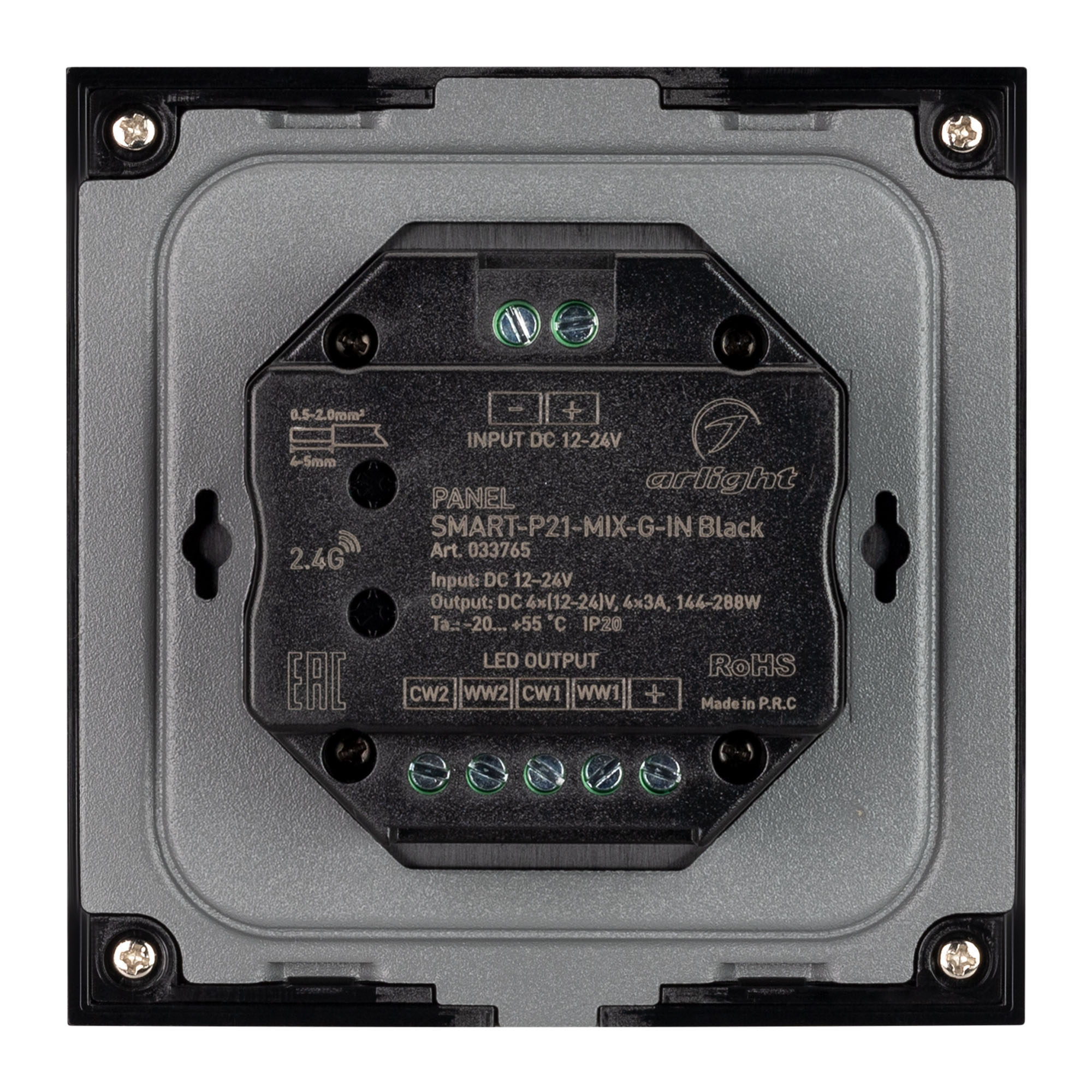 Встраиваемая сенсорная панель чёрного цвета из стекла, с защитой от мелких царапин. Предназначена для управления мультибелыми (MIX) источниками света (ШИМ) с помощью сенсорной полосы. Основные функции: включение/выключение света, регулировка яркости, изменение цветовой температуры. Изделие можно использовать как диммер с 2 парами параллельных выходов для подключения мультибелых светодиодных лент. Возможно применение как однозонный пульт дистанционного управления диммерами и контроллерами серии SMART. Устройство может управляться пультами дистанционного управления или другими панелями серии SMART. К одной панели возможно привязать неограниченное количество диммеров и контроллеров, совместима с диммерами и контроллерами серии SMART, с управлением по радиоканалу 2.4G. Питание 12-24В, 4 канала управления, максимальный ток 3А на канал, суммарная мощность нагрузки 144-288 Вт. Габариты: 86х86х37 мм, корпус пластика, лицевая часть из стекла. Установка в монтажные коробки стандартного размера.