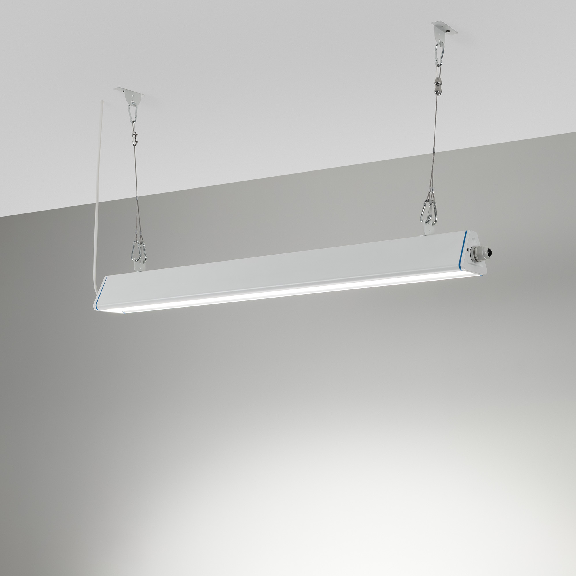 Линейный светильник SP-LAGERN мощностью 150 Вт, дневного цвета свечения 5000K, световым потоком 22000 лм и углом рассеивания 50х90 градусов предназначен для освещения складских и промышленных помещений. Белый цвет корпуса, габариты 885х105х83 мм, степень пылевлагозащиты IP65., индекс цветопередачи CRI 80, степень ударопрочности IK08., присутствует функция защиты от удара молнии. Возможность накладного и подвесного монтажа позволяет легко адаптировать светильники под любые требования помещения. Подвес и крепление для накладного монтажа поставляется в комплекте. Сквозная проводка дает возможность подключить несколько светильников в одну линию, что значительно упрощает процесс установки и экономит время.