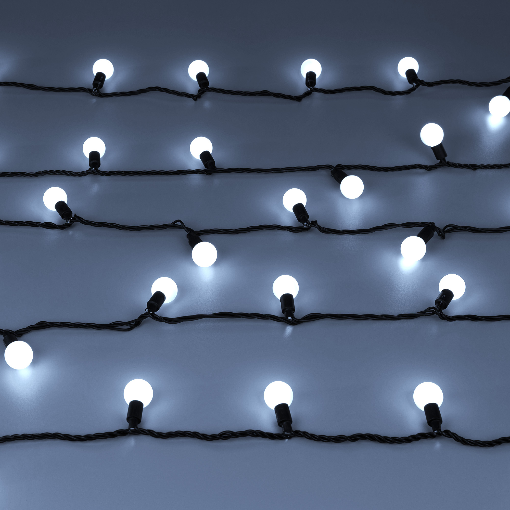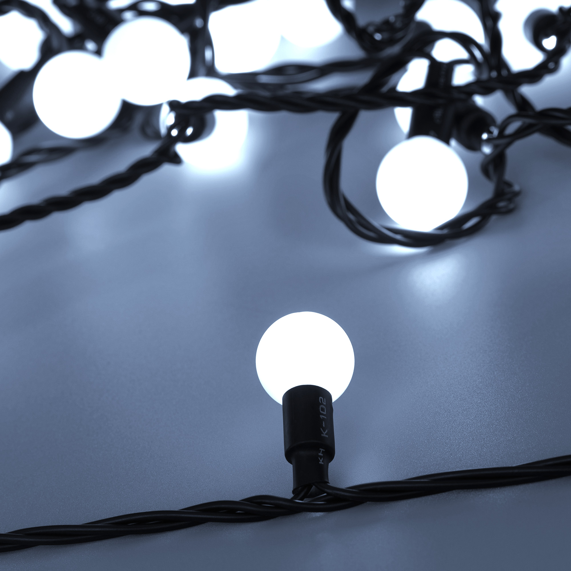 Универсальная светодиодная гирлянда “ШАРИКИ” серии Classic, предназначенная для декорирования и создания праздничного настроения как внутри помещений, так и снаружи (степень пылевлагозащиты IP65 позволяет размещать гирлянду на улице под навесом). Имея длину 20000 мм, она может использоваться для оформления средних и больших площадей. Универсальные соединительные разъемы позволяют наращивать длину до 200 м без использования дополнительных аксессуаров. Выпуклая молочно-белая линза размером 23 мм и эффект непрерывного свечения обеспечивают мягкое, равномерное освещение, выделяя украшаемые объекты. Холодный белый свет помогает создать необходимую атмосферу для декоративного объекта. Провод изготовлен из ПВХ и окрашен в чёрный цвет. Аксессуары для подключения приобретаются отдельно.