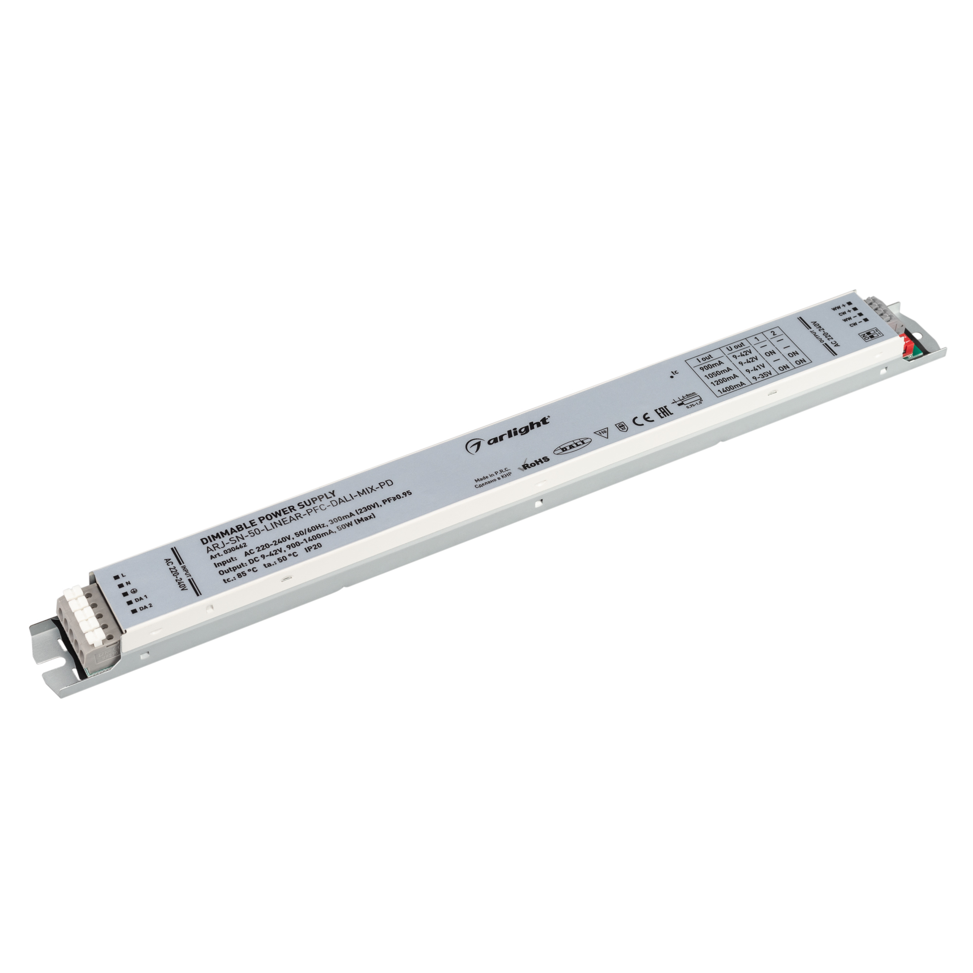 Диммируемый источник питания DALI DT8 для светодиодных MIX (CCT, Tunable White) светильников. Выбор значения выходного тока осуществляется DIP-переключателями на корпусе. Низкий пусковой ток <18А. Вход 220-240V AC, PF>0.95 выход 900trash400mA@9-42V DC (в зависимости от вых. тока), мощность 50W. Защита от КЗ на выходе, перегрузки, перегрева. Размеры 360x30x21 мм.