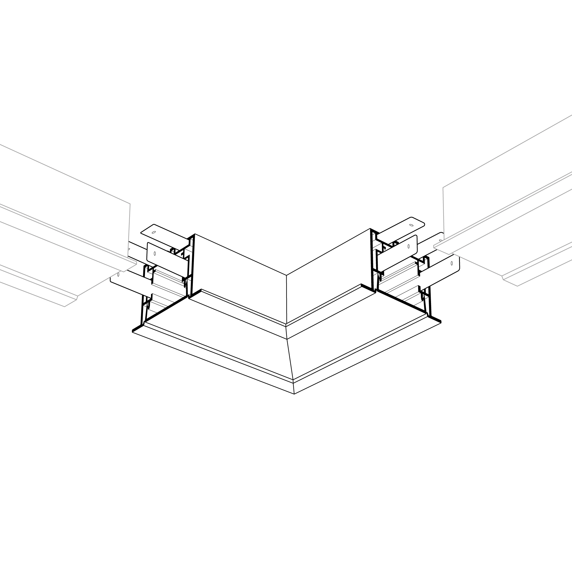 Прямой угол в сборе для соединения двух профилей S2-LINIA55-F под прямым углом 90° в одной плоскости в комплекте с матовым экраном и соединителями. Экран образует линию на плоскости. Применятся при изготовлении светильников сложной геометрии.