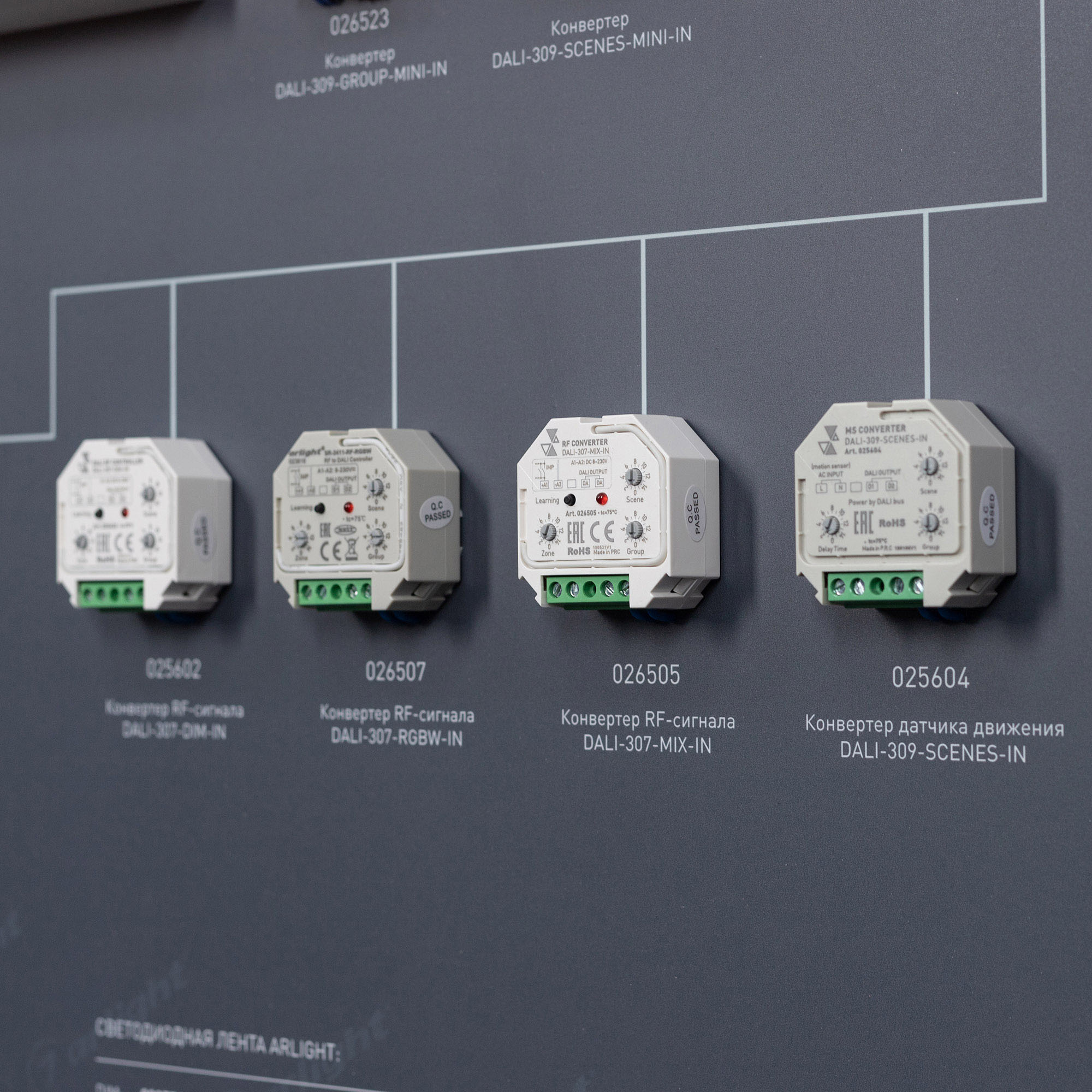 На стенде представлены основные типы устройств для управления освещением по протоколу DALI, возможности интеграции с прочими аналоговыми и цифровыми протоколами / системами управления.