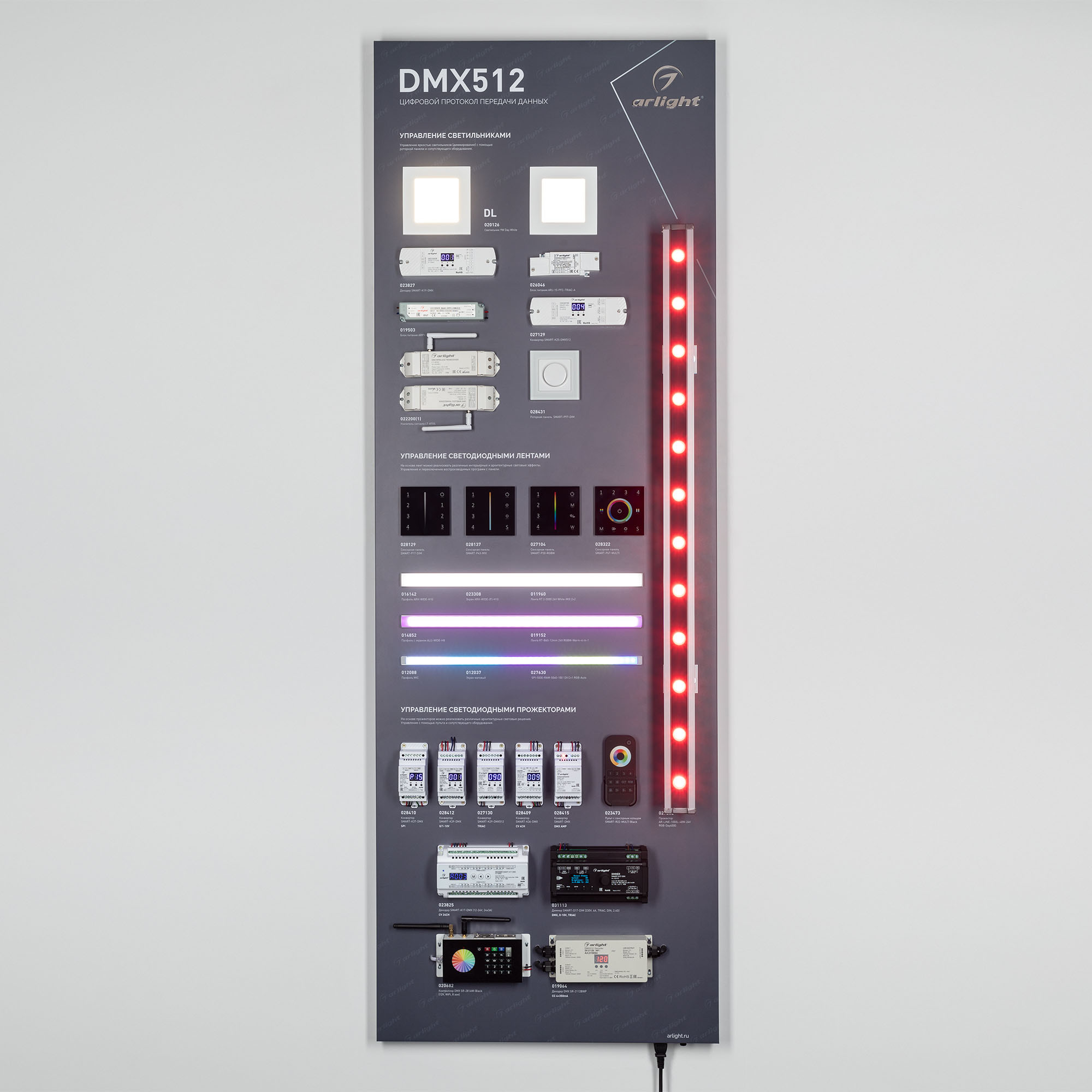 На стенде визуализирован процесс управления освещением с помощью протокола DMX512 для динамического управления освещением.