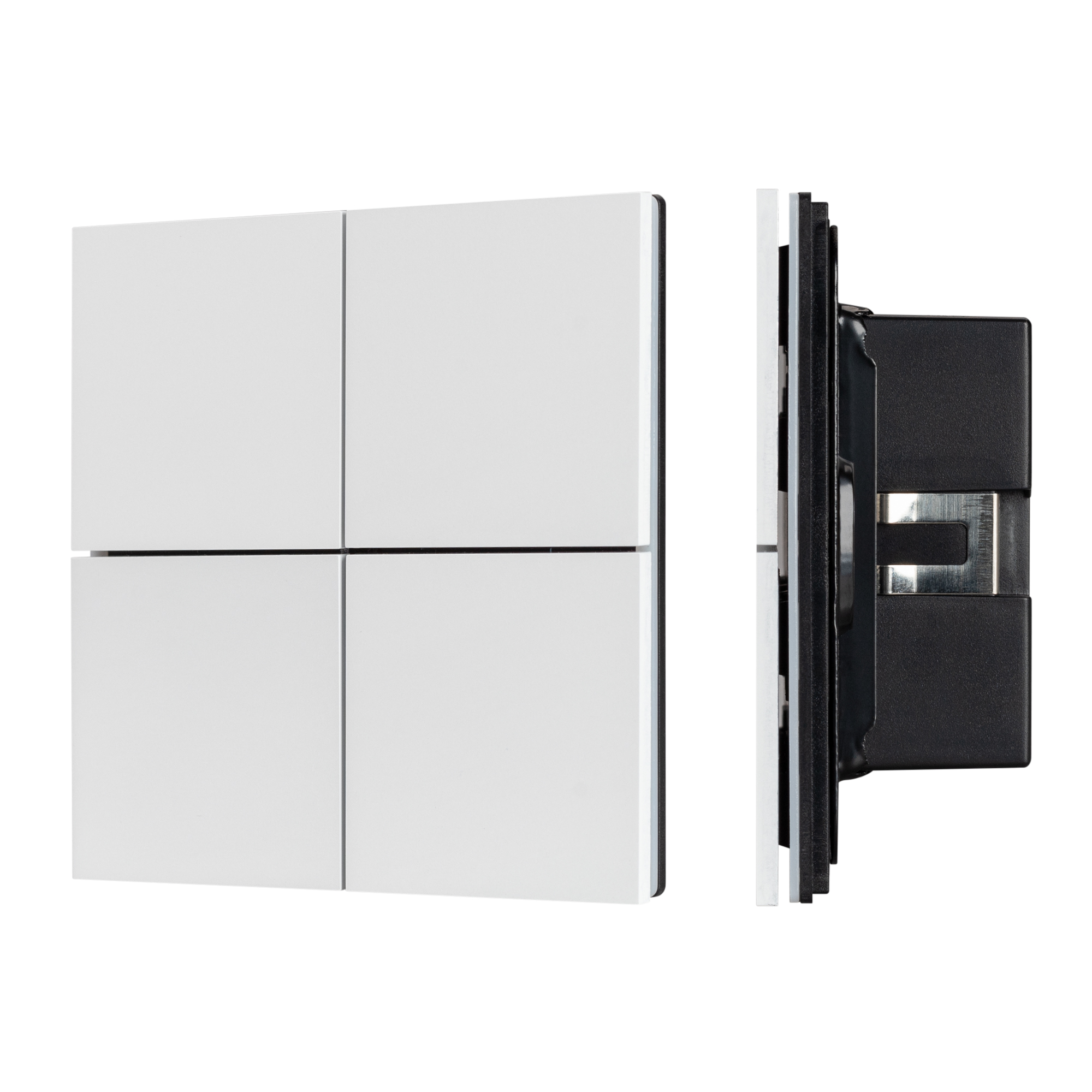 Встраиваемая металлическая панель белого цвета с кнопочным управлением, предназначенная для включения и выключения световых сцен в системах управления светом KNX. Позволяет осуществлять включение/выключение, диммирование, управление шторами и жалюзи, управлять сценами. Поддерживает управление с помощью 4 настраиваемых рокерных клавиш. Каждая клавиша может выполнять функции 2-х клавиш. Устройство совместимо с исполнительными устройствами стандарта KNX, в том числе, мировых производителей ABB, SCHNEIDER ELECTRIC, SIEMENS, ZENNIO и другими. Удобное и точное управление при помощи отдельных механических кнопок для каждой функции. Питание от шины KNX. Габариты устройства составляют 86x86x33 мм. Пластиковый корпус, цвет белый, безрамочный корпус, материал – алюминий, отклик вибрацией, светодиодная индикация.
