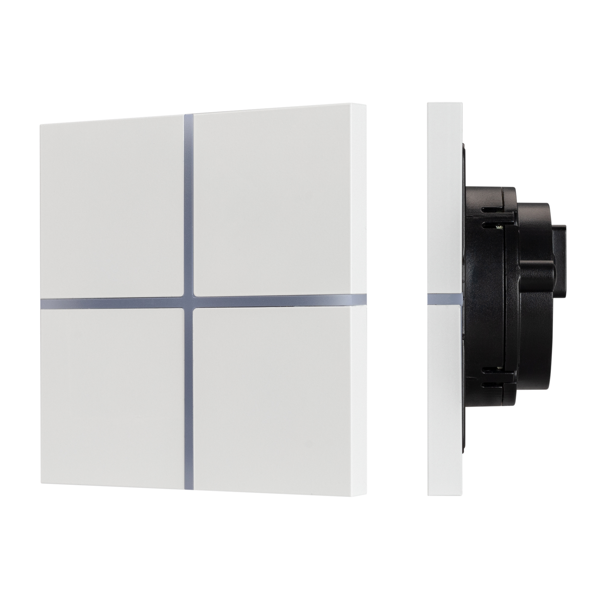 Встраиваемая металлическая панель белого цвета с сенсорным управлением, предназначенная для включения и выключения световых сцен в системах управления светом KNX. Позволяет осуществлять включение/выключение, диммирование, управление шторами и жалюзи, управлять сценами. Поддерживает управление с помощью 4 настраиваемых сенсорных клавиш. Устройство совместимо с исполнительными устройствами стандарта KNX, в том числе, мировых производителей ABB, SCHNEIDER ELECTRIC, SIEMENS, ZENNIO и другими. Удобное и точное управление при помощи отдельных сенсорных кнопок для каждой функции. Питание от шины KNX. Габариты устройства составляют 86x86x33 мм. Пластиковый корпус, цвет белый, безрамочный корпус, материал – алюминий, отклик вибрацией, светодиодная индикация.