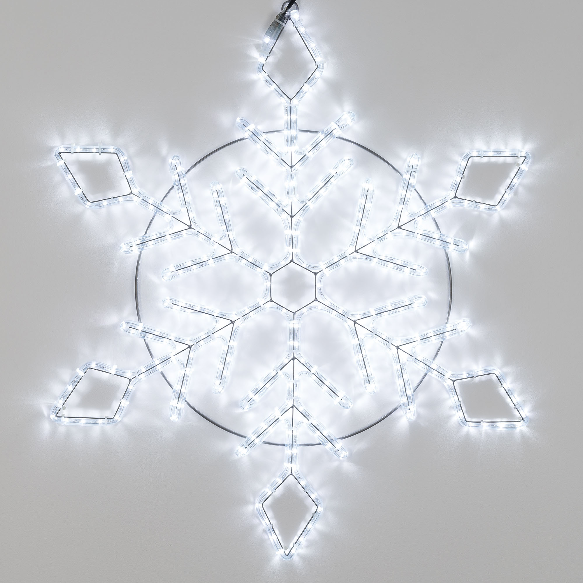 Светодиодная фигура СНЕЖИНКА отлично подходит для украшения и создания праздничной атмосферы как внутри помещений, так и снаружи (степень пылевлагозащиты IP65 позволяет размещать гирлянду на улице под навесом). Размер фигуры 900×900 мм. Холодный белый свет и постоянное свечение помогают создать сказочную атмосферу в выбранной локации. Фигура укомплектована проводом питания для подключения к сети 230 В (без вилки питания).