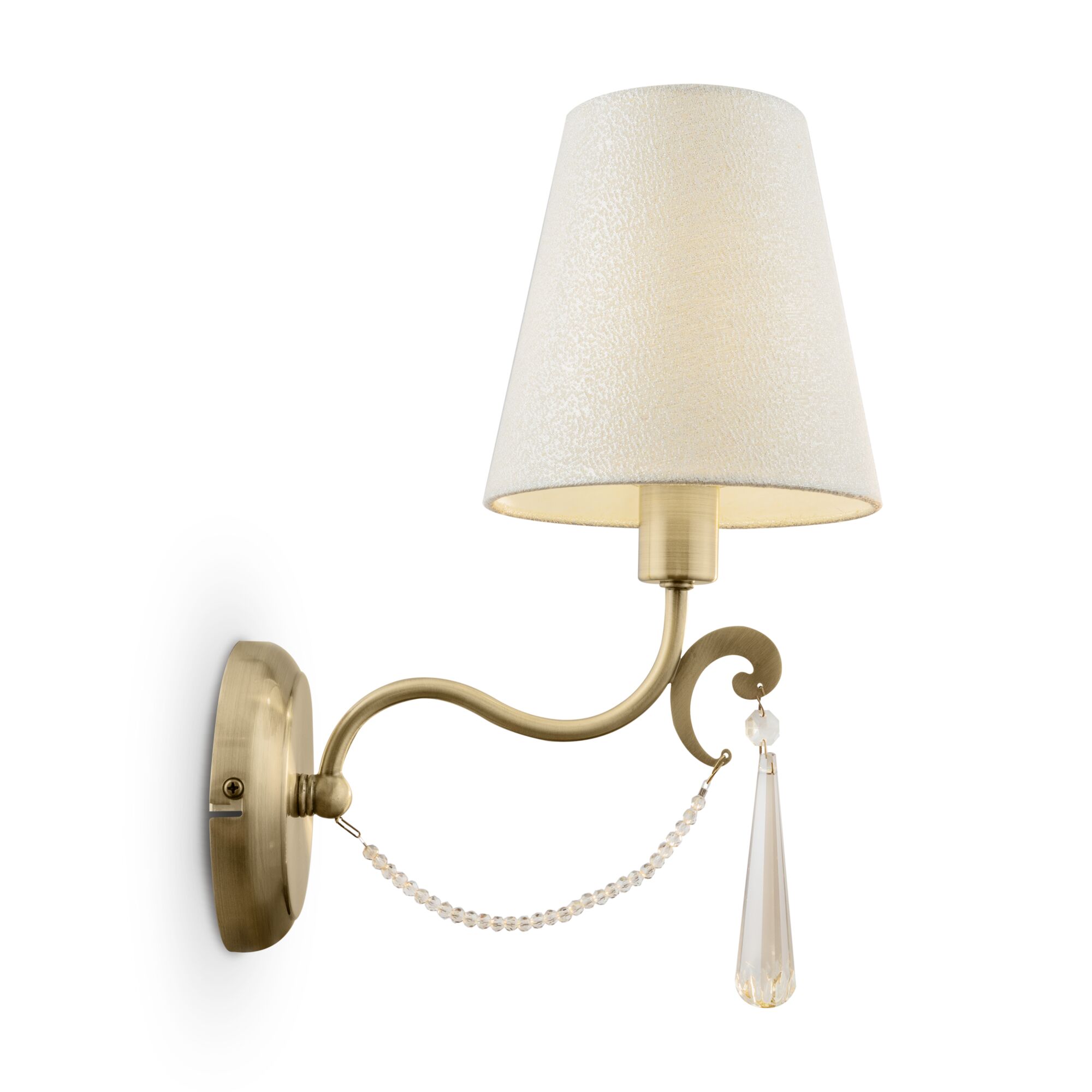 Металлическая арматура. Цвет – латунь. Абажуры из фактурной ткани белого цвета. Декор – хрустальные подвесы каплевидной формы. Одиночный подвес и торшер с цоколем Е27, лампа, бра и люстры – Е14.