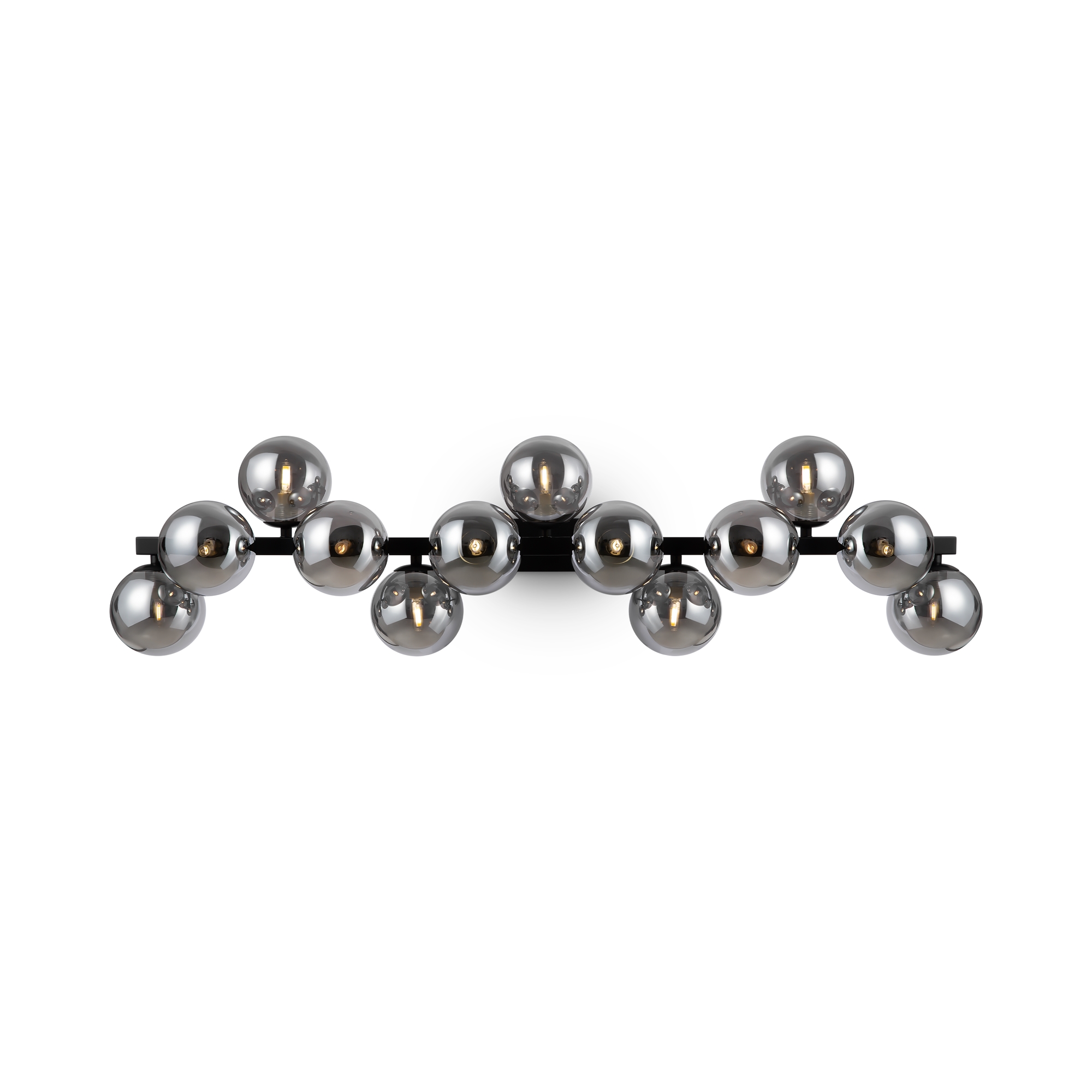 Металлическая арматура в четырех цветах: матовый черный, хром, золото, латунь. Плафоны — выдувное стекло. Цвета — дымчатый, янтарный, коньячный. Дизайн с имитацией молекулярной структуры. Высота подвесных светильников регулируется тросом. Лампа с цоколем G9.