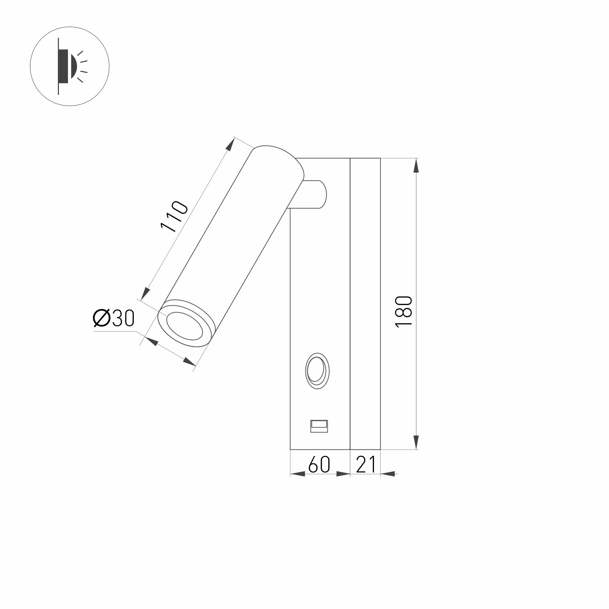 Накладной настенный светильник 3Вт, чёрный алюминиевый корпус. Цвет ТЕПЛЫЙ БЕЛЫЙ 3000K, св.поток 200лм, CRI(Ra)>80, угол 20°. Размер Основание 180х60х21мм, Светоизлучатель Ø30×110 мм. IP20. Питание AC220-240V, 3Вт, встроенный драйвер. Встроенный USB порт для зарядки.