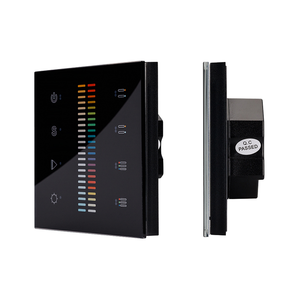 Встраиваемая стеклянная черная Touch-панель с сенсорным слайдером, 4 зоны, 1-2 зона CCT, 3-4 зоны RGB. Управление – по радиоканалу (совместимы с контроллерами SRtrash009x). Питание 220 В. Размер 86x86x29мм.