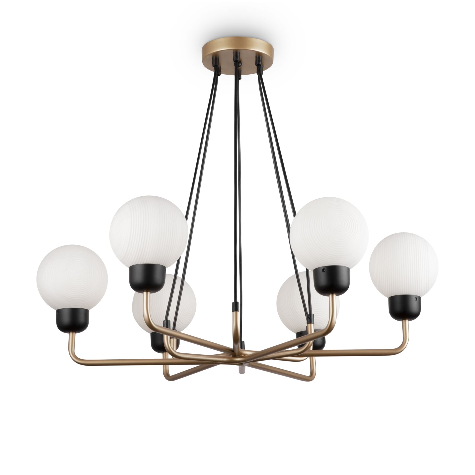 Легкость минимализма в сочетании с эстетикой постмодерна создает яркий и узнаваемый облик серии Venetti. Конструктивные особенности светильников, в частности, отсутствие центрального стержня, облегчают композицию, делая её компактной и невесомой. Арматура выполнена из металла золотого оттенка, а плафоны – из белого стекла. Их сферическая форма обеспечивает мягкое распределение светового потока, а модный рельефный рисунок добавляет дизайну индивидуальности. Серия включает подвесные люстры на 4 и 6 плафонов и предназначена для интерьеров в стиле лофт, mid-century modern, минимализм.