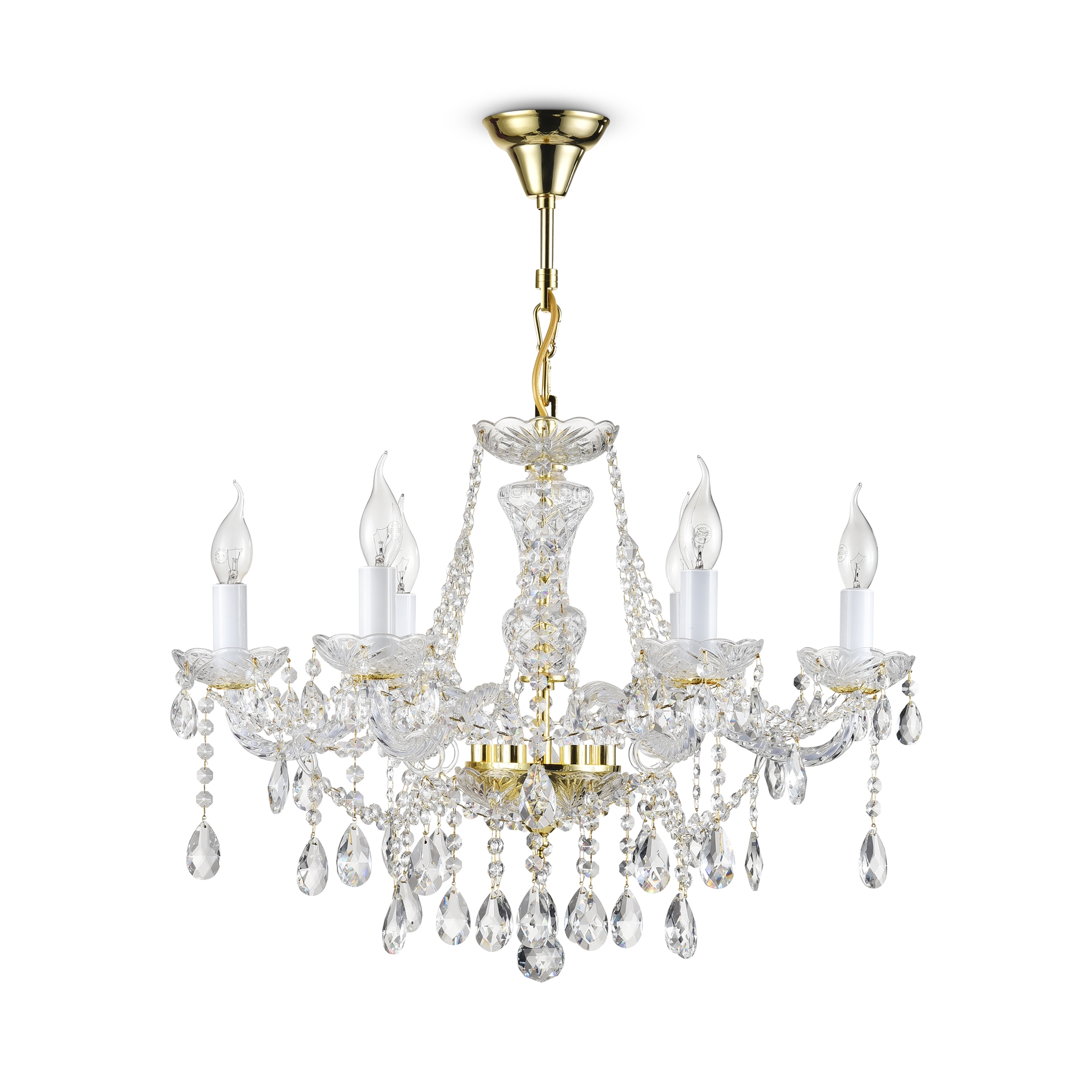 Металлическая арматура золотого цвета. Рожки – витое прозрачное стекло. Рельефный стеклянный декор обрамляет контуры светильника. Подвески из крис таллов различных форм и огранки.