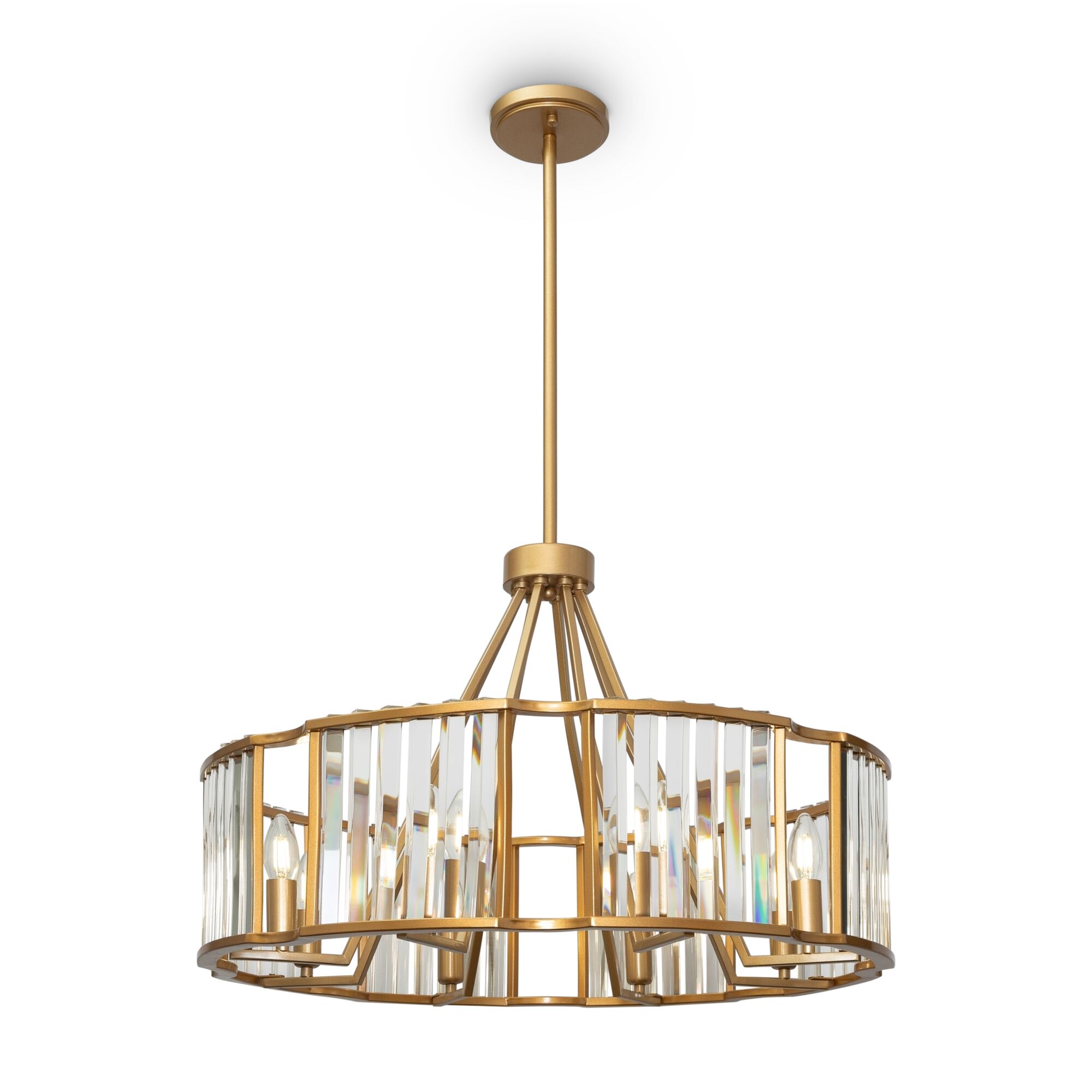 Арматура из металла в золотом цвете. Прозрачный стеклянный декор закреплен на металлическом каркасе, окрашенном в тоне арматуре. Источники света в форме свечей.