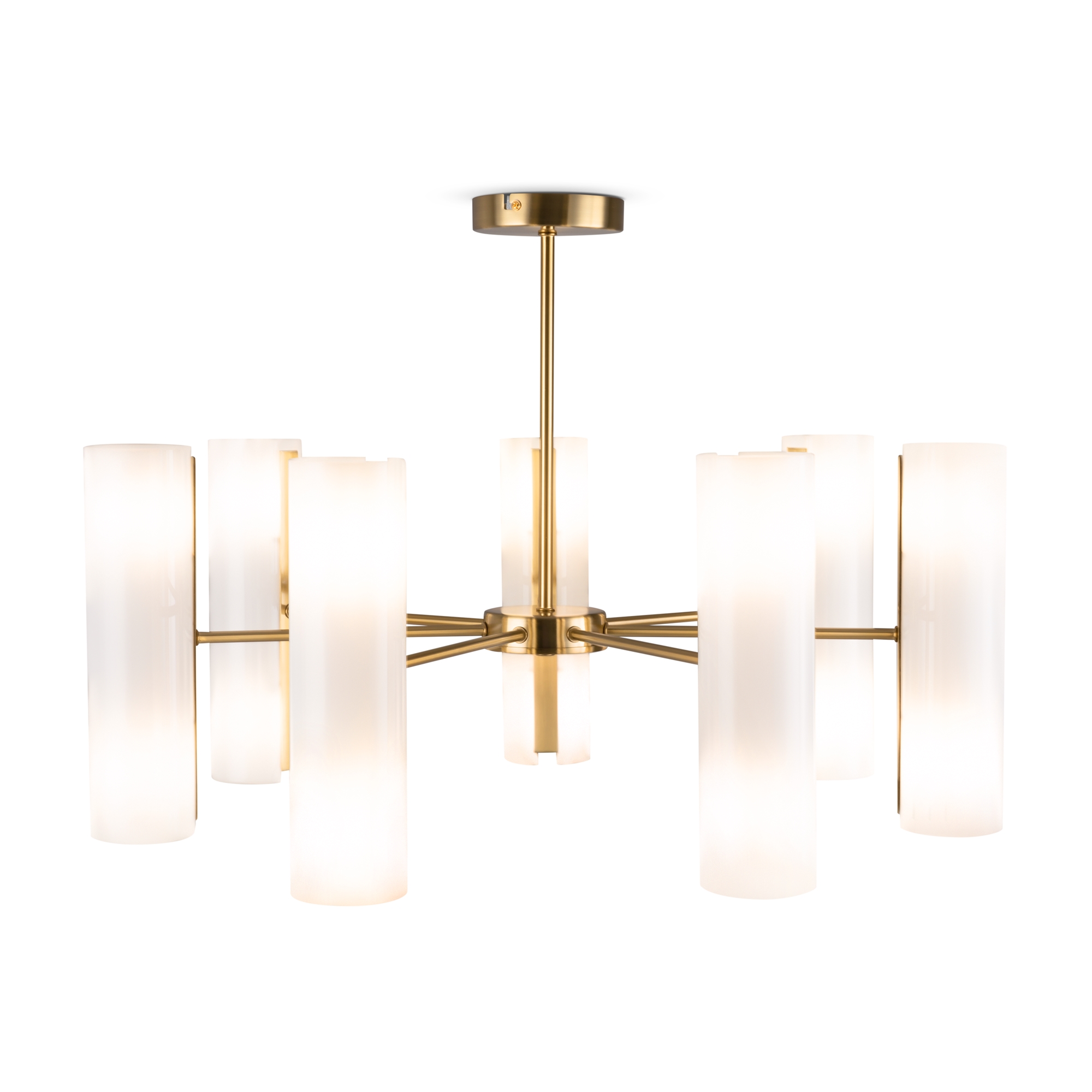 Арматура — металлическая, цвет — латунь. Стеклянные белые плафоны-цилиндры мягко рассеивают свет в стороны. Открытые края плафонов и глянцевая поверхность дают дополнительный свет в вверх и вниз для максимальной освещенности. Источник света — лампа с цоколем Е14.