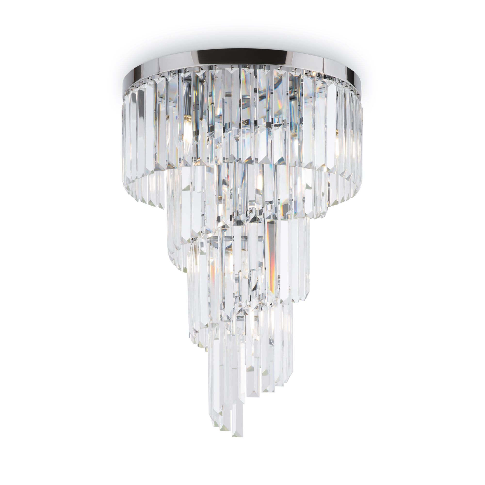 Металлическая арматура, цвет – хром. Многоярусный декор из хрустальных под весок и стеклянных элементов. Трендовая асимметрия в дизайне.