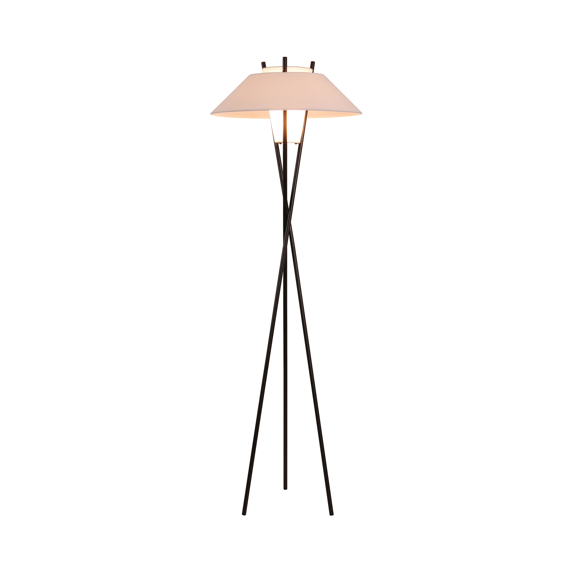 Торшер на треноге. Металлическая арматура в двух оттенках: никель и черный. Двухслойный текстильный абажур в белом цвете. Цоколь Е27.