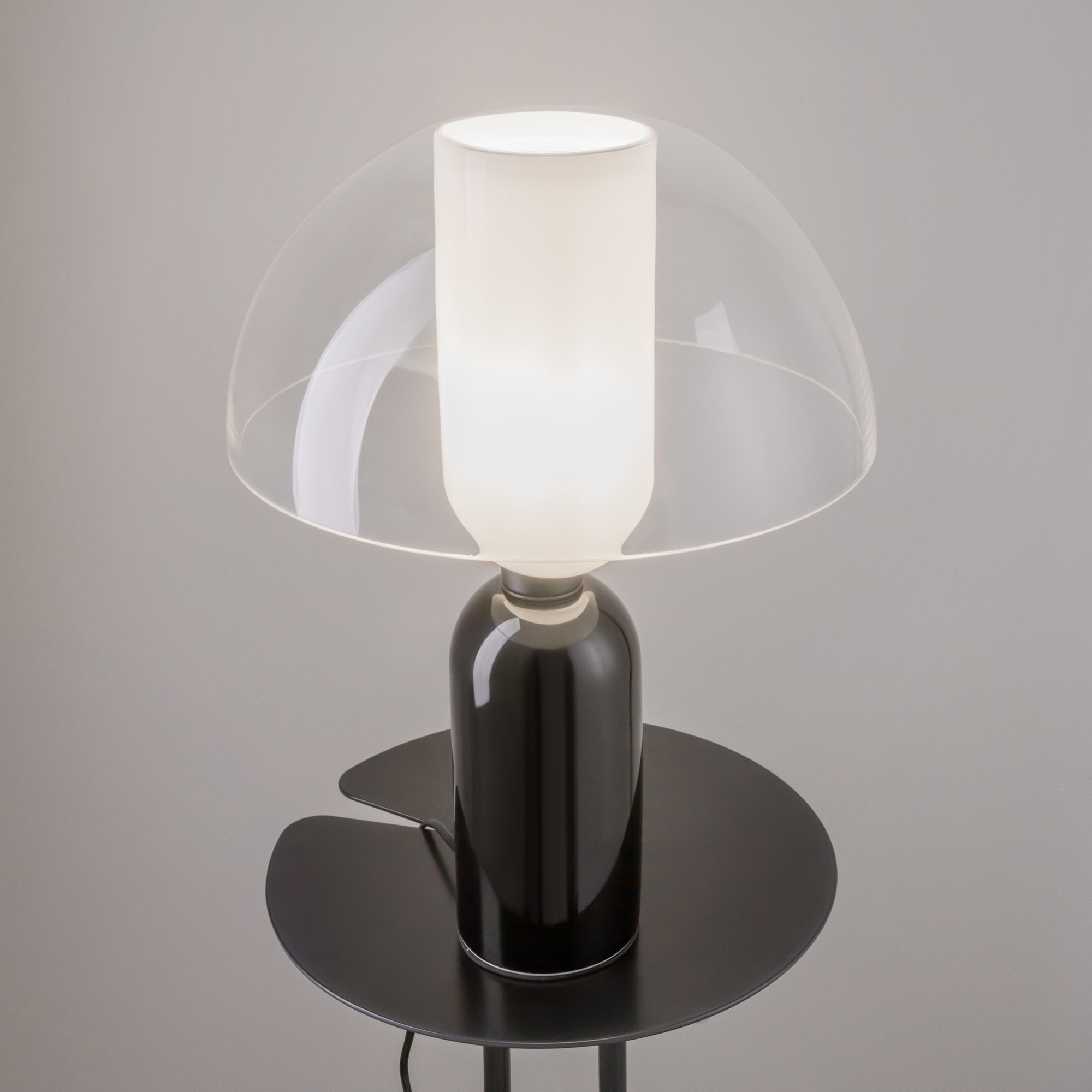 Металлическая арматура, цвет – черный. Светильники стилизованы под форму песочных часов с обтекаемой формой. Керамические элементы с глянцеовй глазурью. Подвесные светильники с плафонами из белой керамики с прозрачным, черно-белым, золото-белым и белым стеклом. Регулируемая высота подвесных светильников.