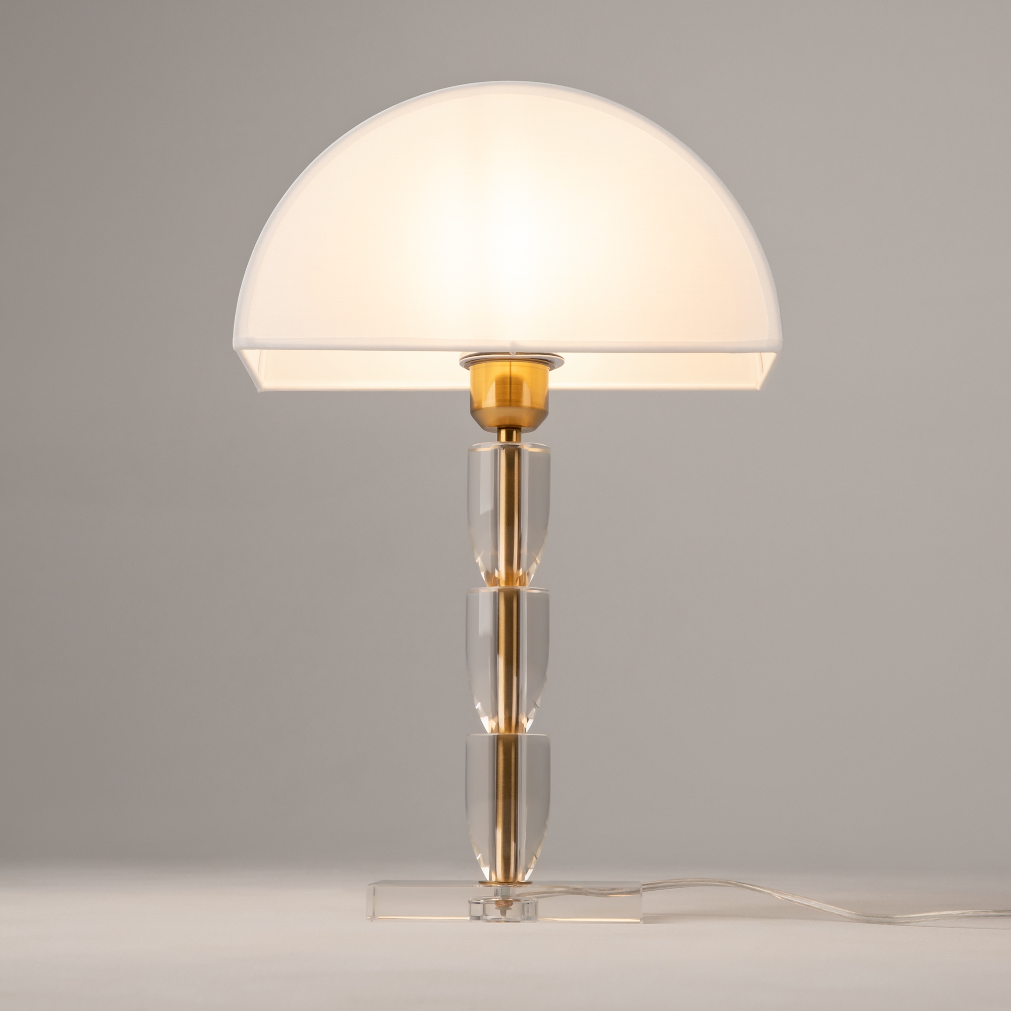 Арматура – металл, цвета – хром, латунь. Хлопковый абажур в белом цвете. Прозрачный акриловый декор в основании. Эстетика Баухауса, трендовая форма абажура. Источник света – лампа с цоколем Е27.