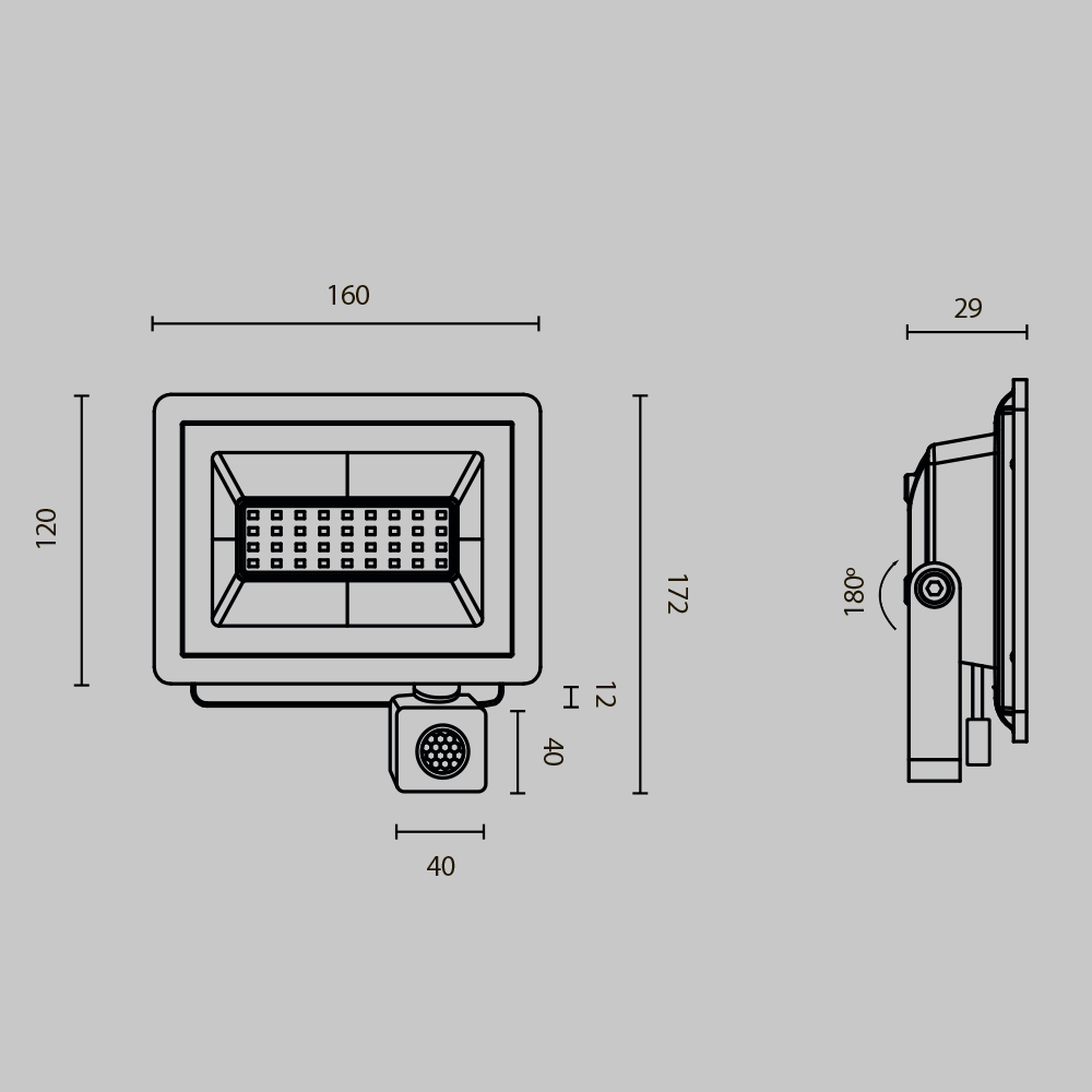 Прожекторы для освещения экстерьеров, рабочих пространств, производственных и промышленных помещений. Материал корпуса — алюминий. Цвет — чёрный. LED-источник света. Два варианта цветовой температуры – 4000К и 6500К. Пять размеров с соответствующими вариантами мощности — 10, 30, 50 Вт с датчиком движения. Модели 100 и 150 Вт без датчиков движения. Высокая степень защиты от пыли и влаги IP65.