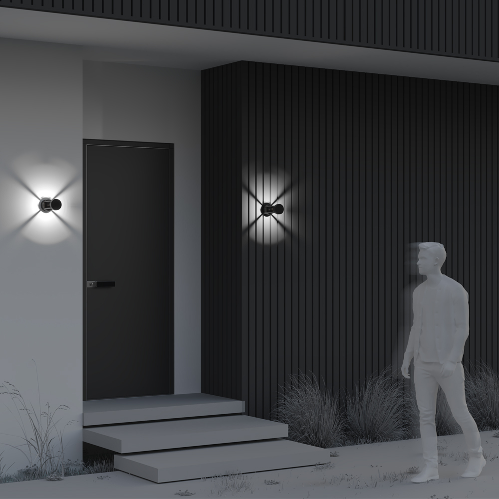 Металлический корпус, цвет – графит. Узорное свечение через призму линий округлого корпуса. LED-источник света – цветовая температура – 3000К. Настенную модель можно использовать в качестве ландшафтной. Высокая степень защиты – IP65.