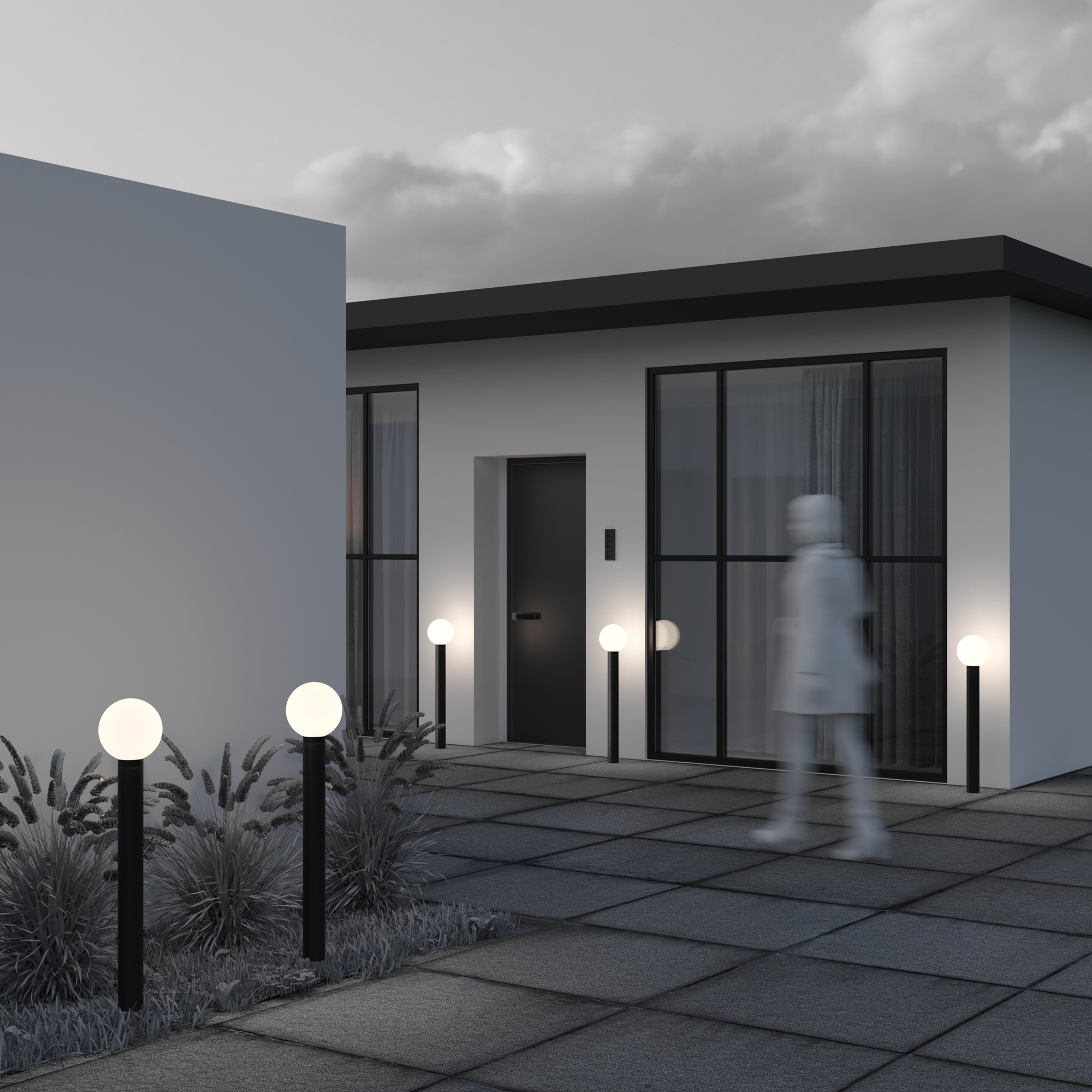 Алюминиевый корпус. Оттенки – черный, серый. Сферические плафоны из белого матового стекла. Защита от коррозии и перападов температур. Высокая степень защиты — IP 54. Источник света — лампа с цоколем E27.