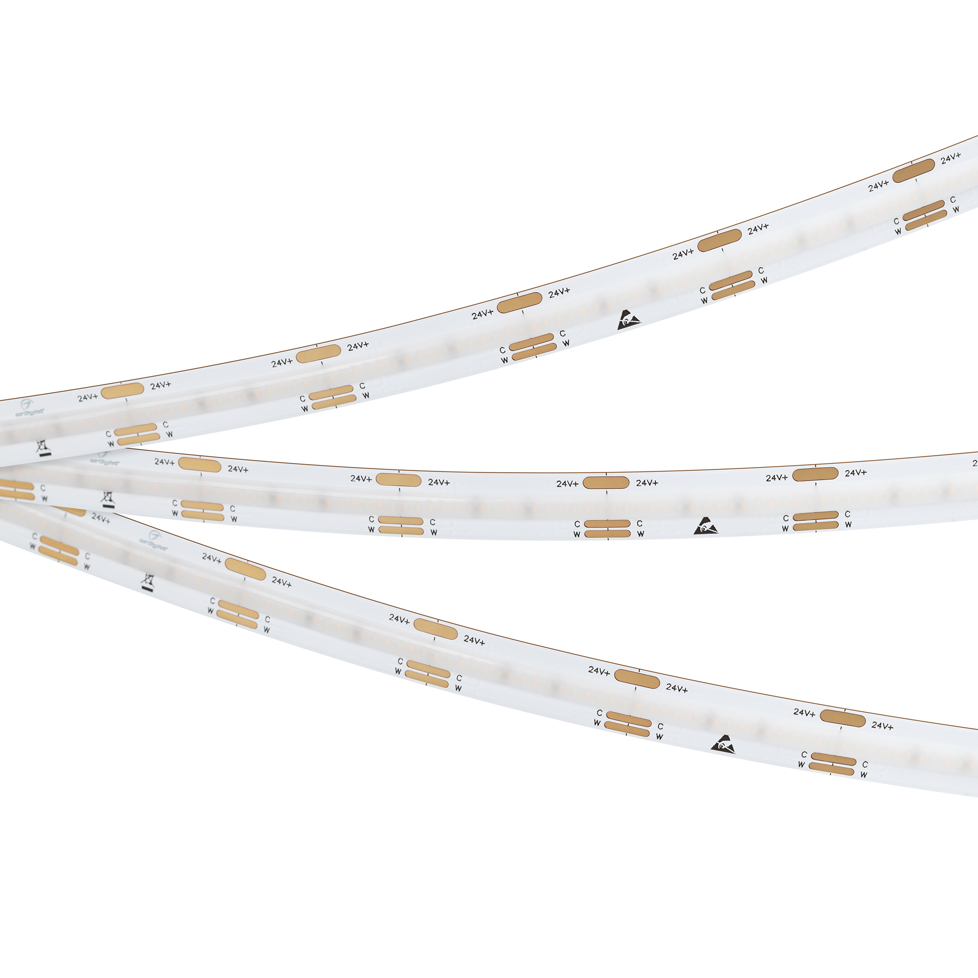 Светодиодная лента сплошного свечения COB серии X576, шириной 10 мм, мощностью 9.6 Вт/м, с изменяемым цветом белого свечения в широком диапазоне (MIX) от теплого (2700K) до белого (6000K). Напряжение питания 24 В. Светодиоды CSP, (576 шт/м). Высокий индекс цветопередачи CRI>90. Минимальный отрезок 27.78 мм (16 светодиодов). Двухканальная лента COB с тремя проводами для подключения, управляется любым MIX-контроллером. Применяется для создания биодинамического освещения, декоративной подсветки интерьера, ниш, рекламных конструкций, витрин, рабочих зон, зон отдыха, мебели.