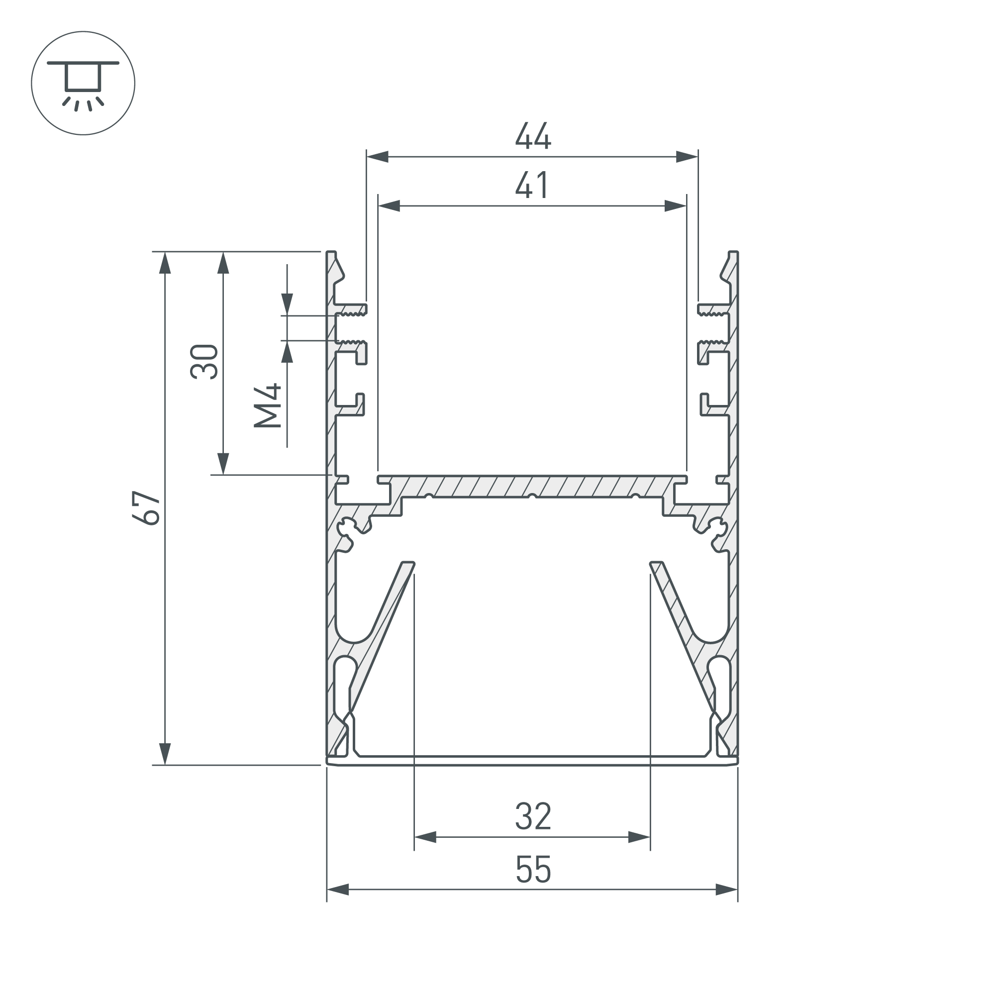 Габаритные размеры профиля составляют 2000 мм в длину, 55 мм в ширину и 67,4 мм в высоту. Площадка для установки светодиодных лент позволяет использовать ленту шириной до 32,2 мм и мощностью до 64 Вт/м. Это обеспечивает гибкость в выборе светодиодных лент и создает потрясающие световые решения.