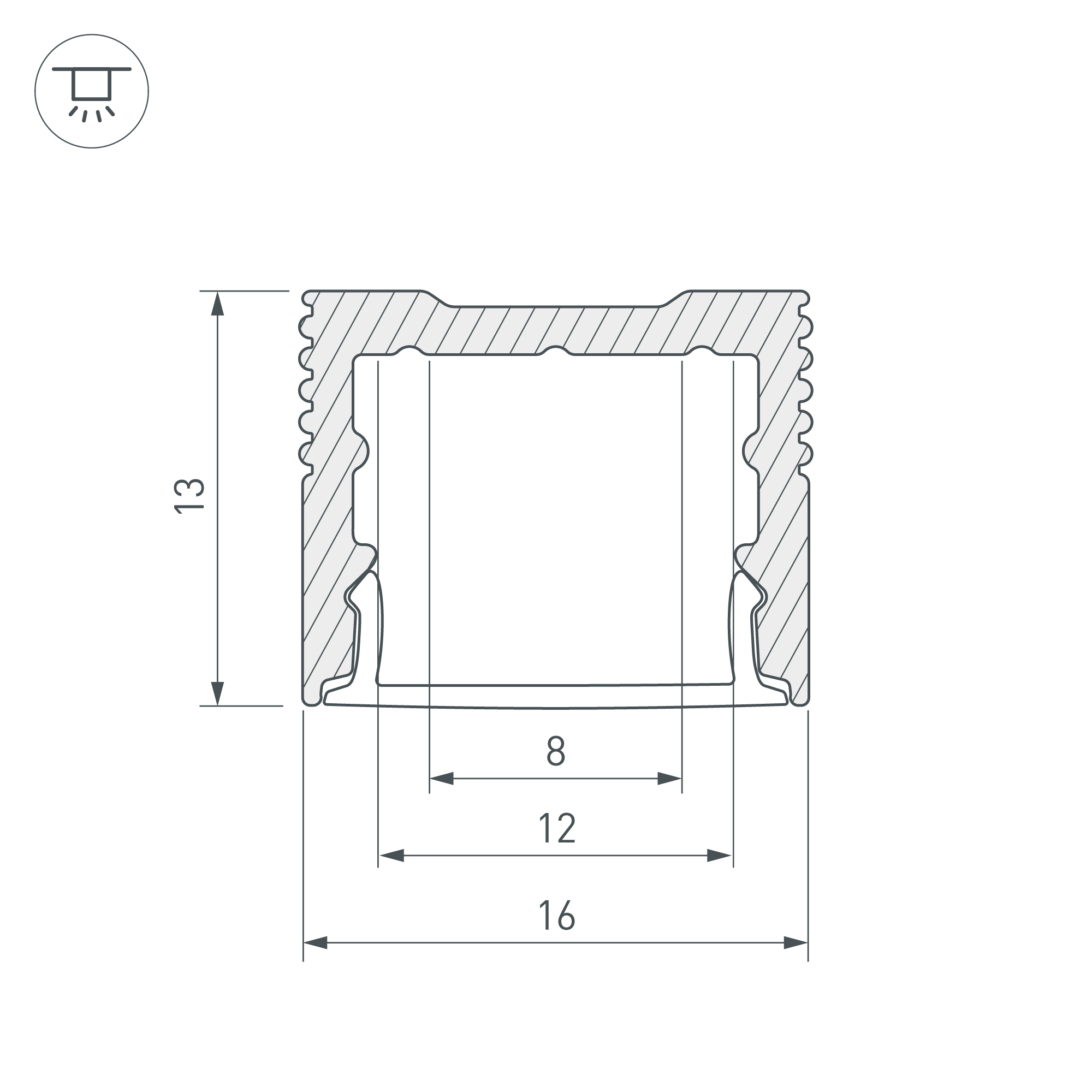 Накладной профиль из анодированного алюминия в комплекте с матовым экраном со светопропусканием 63%, заглушками и держателями для декоративного освещения интерьера. Габаритные размеры профиля составляют 2500 мм в длину, 16 мм в ширину и 13 мм в высоту. Площадка для установки светодиодных лент позволяет использовать ленту шириной до 12 мм и мощностью до 15,2 Вт/м. Это обеспечивает гибкость в выборе светодиодных лент и создает потрясающие световые решения.