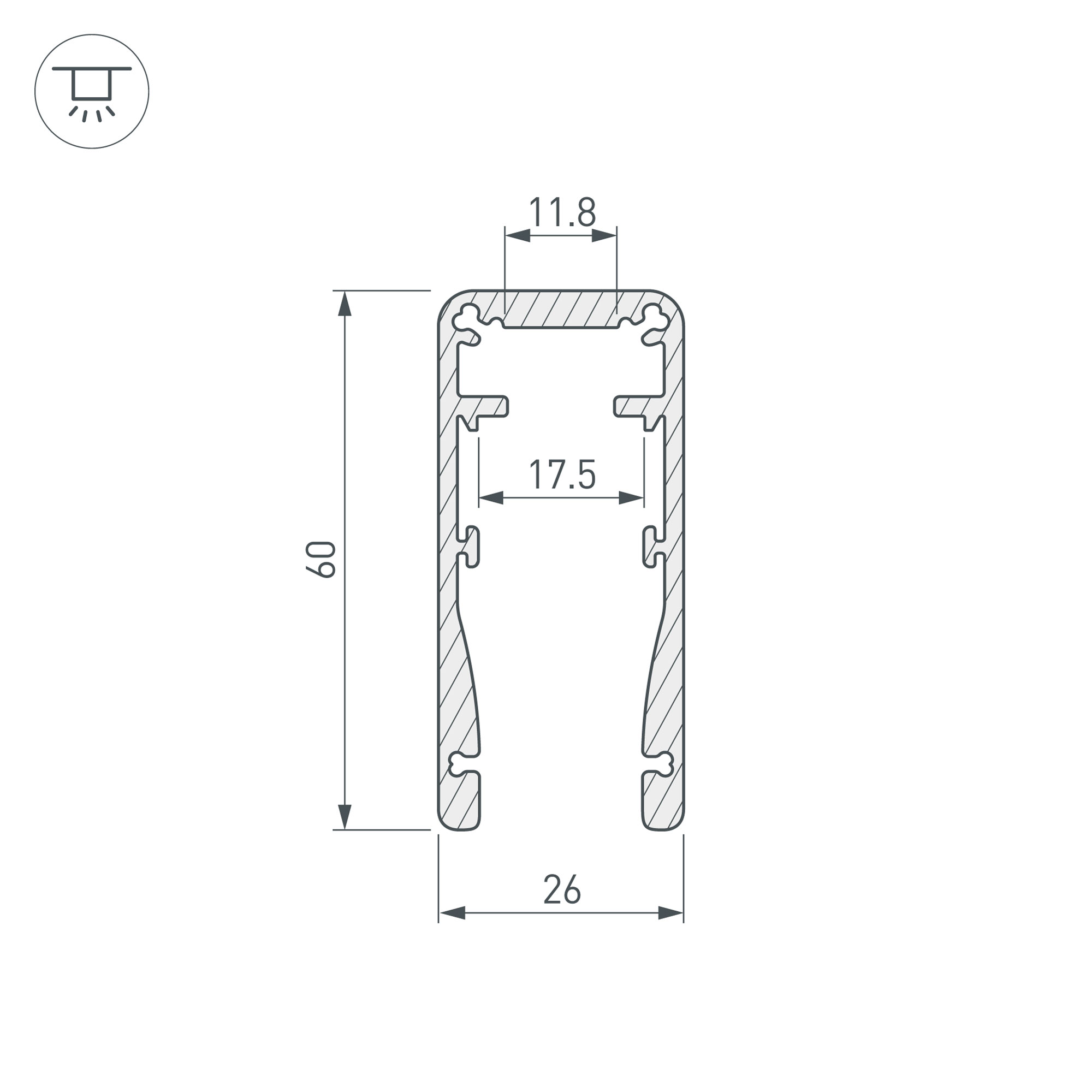 Накладной алюминиевый профиль для подсветки стекла толщиной от 17,5 мм. Устанавливается на стекло сверху в качестве перил. Габаритные размеры профиля составляют 2000 мм в длину, 26 мм в ширину и 60 мм в высоту. Площадка для установки светодиодных лент позволяют использовать ленту шириной до 11,8 мм и мощностью до 45,1 Вт/м. Это обеспечивает гибкость в выборе светодиодных лент и создает потрясающие световые решения.