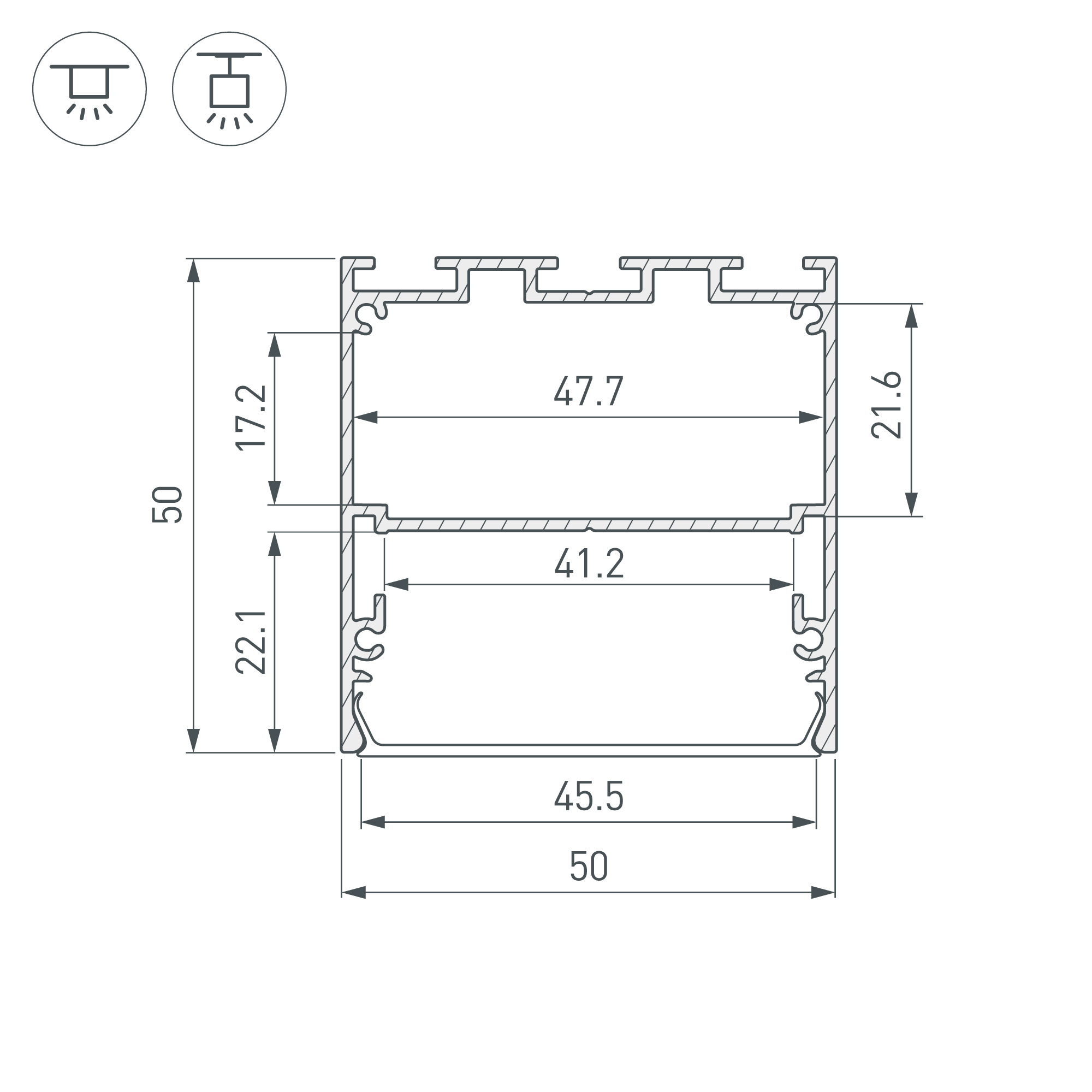 Габаритные размеры профиля составляют 2000 мм в длину, 50 мм в ширину и 50 мм в высоту. Площадка для установки светодиодных лент позволяет использовать ленту шириной до 41,2 мм и мощностью до 52,5 Вт/м. Это обеспечивает гибкость в выборе светодиодных лент и создает потрясающие световые решения.