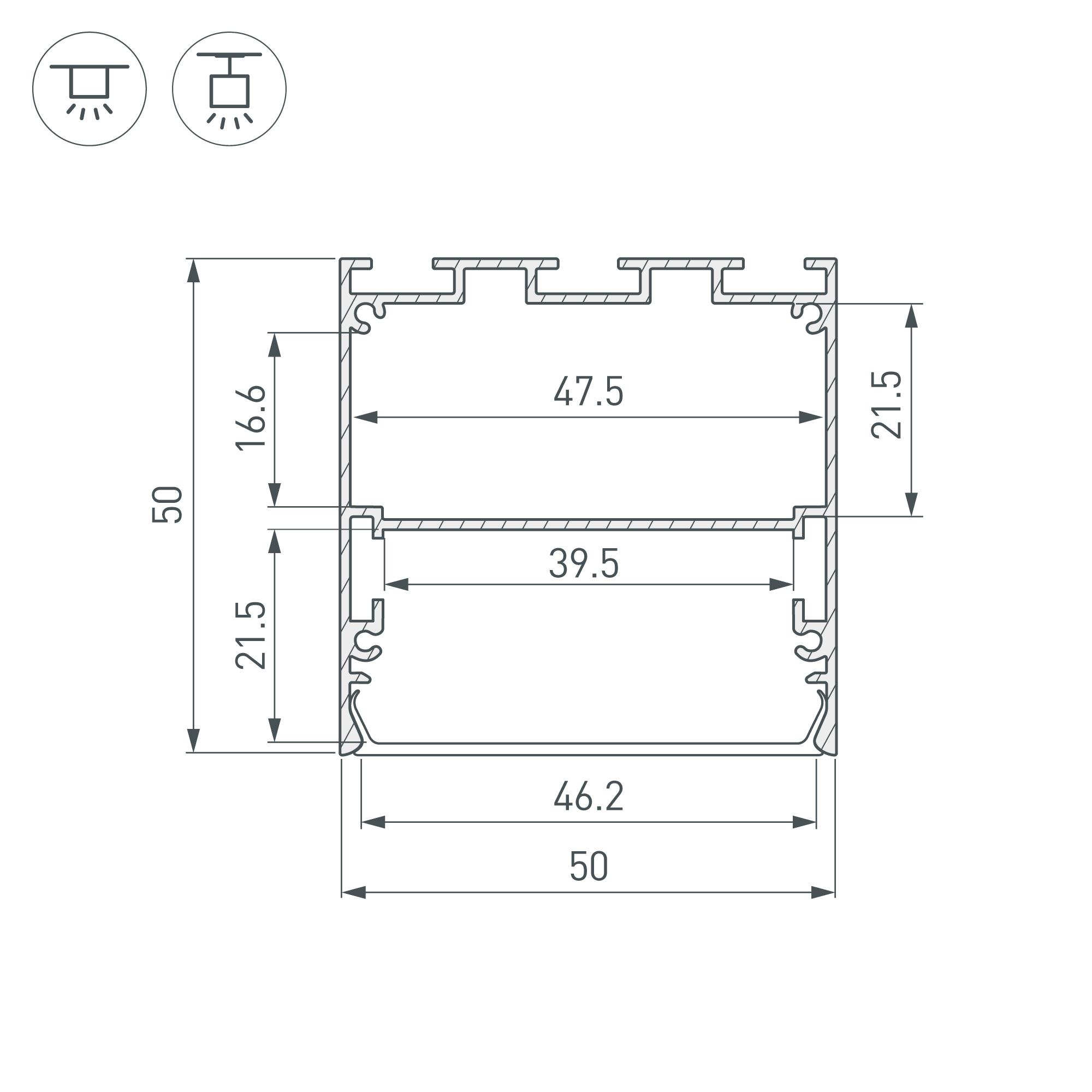 Подвесной/накладной профиль из анодированного алюминия с отсеком для блока питания (39,5х21,5 мм) для основного освещения и контурной подсветки.