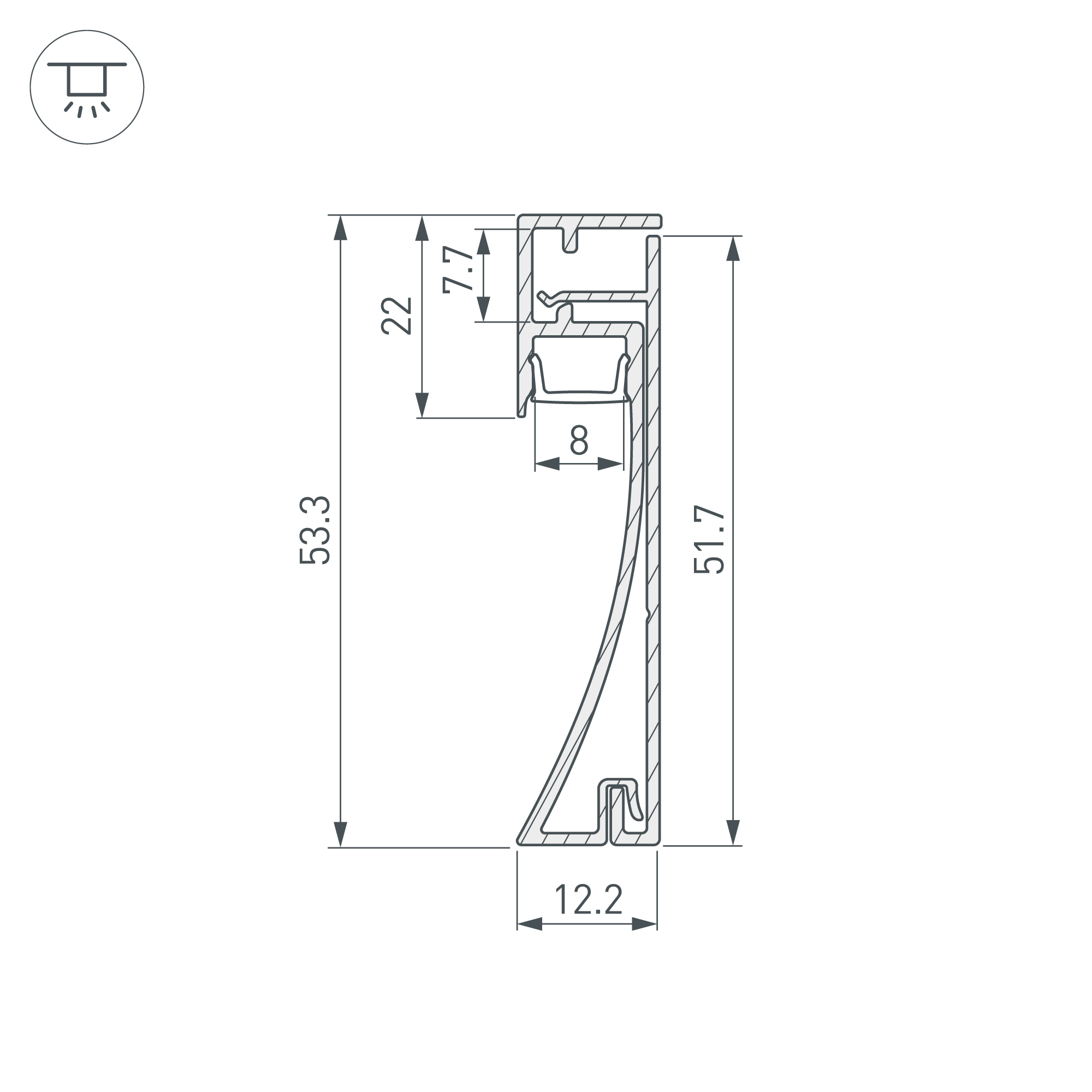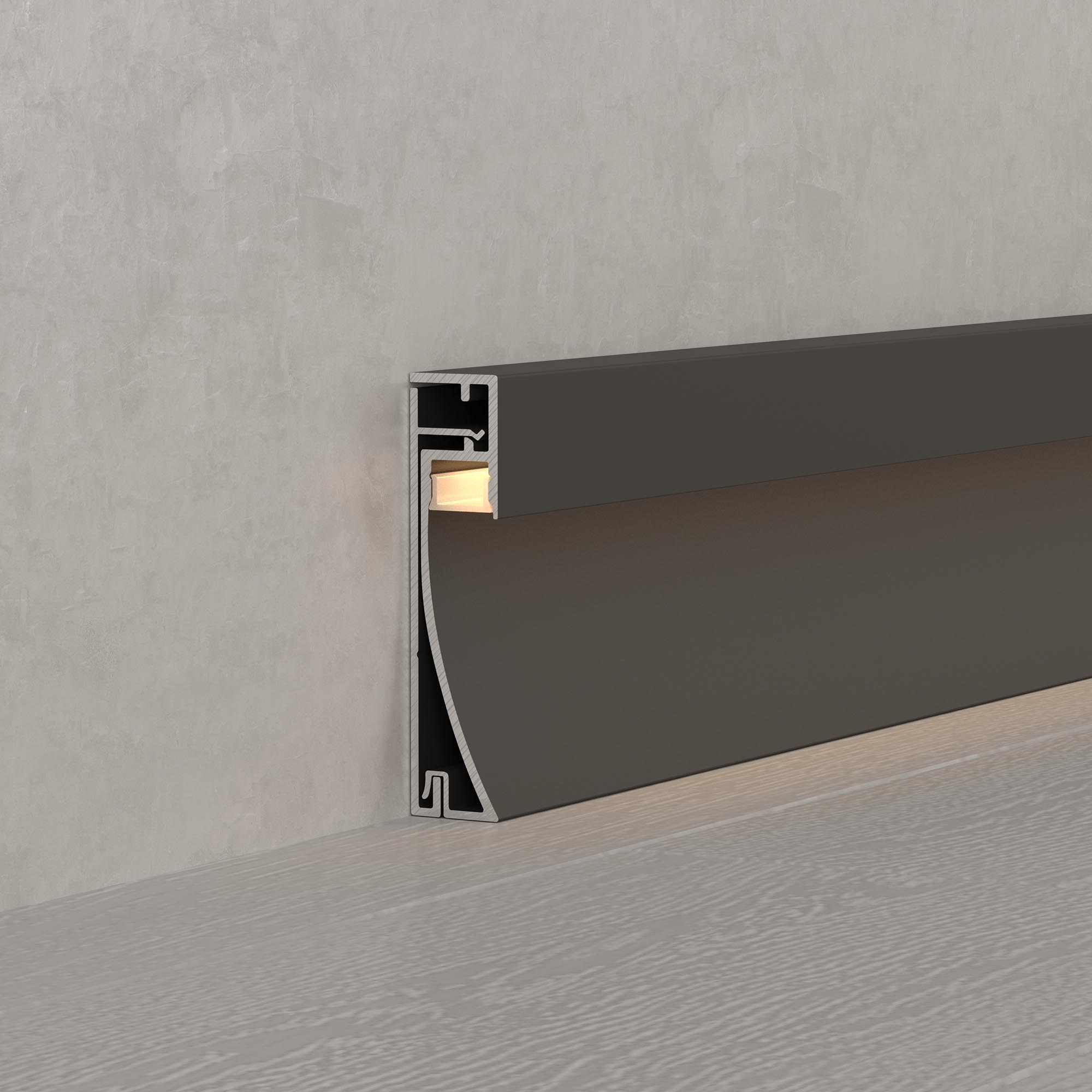 Накладной двухкомпонентный алюминиевый профиль-плинтус черного цвета для контурной подсветки помещения. Габаритные размеры профиля составляют 2000 мм в длину, 12,2 мм в ширину и 53,3 мм в высоту. Площадка для установки светодиодных лент позволяет использовать ленту шириной до 8 мм и мощностью до 20 Вт/м. Это обеспечивает гибкость в выборе светодиодных лент и создает потрясающие световые решения.