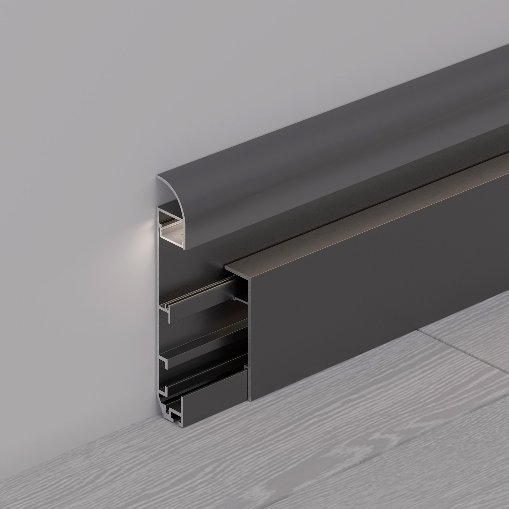 Накладной двухкомпонентный алюминиевый профиль-плинтус с кабель-каналом черного цвета для контурной подсветки помещения. Габаритные размеры профиля составляют 2000 мм в длину, 14,8 мм в ширину и 79,7 мм в высоту. Площадка для установки светодиодных лент позволяет использовать ленту шириной до 8 мм и мощностью до 20 Вт/м. Это обеспечивает гибкость в выборе светодиодных лент и создает потрясающие световые решения.